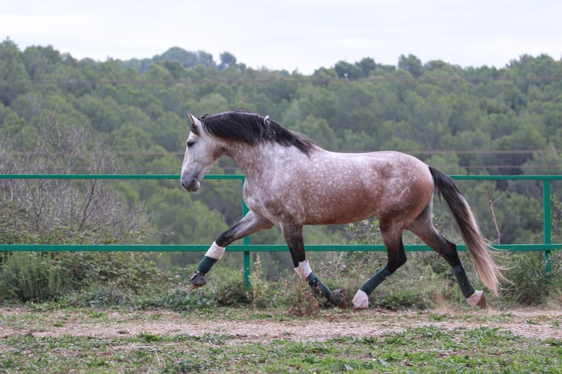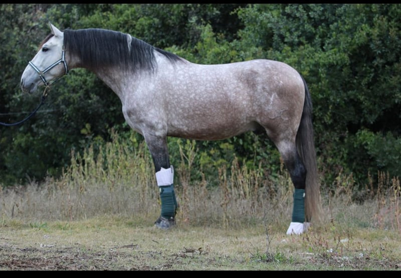 Five-year-old PRE stallion, very handsome and gentle. You can do everything with him calmly and confidently. He is a full horse but very noble, enjoys working both in the arena and in the field. He is a typical Spanish horse. X-ray available. Excellent pedigree and movements suitable for dressage.