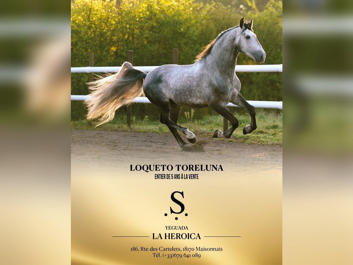 Superbe Pure Race Espagnole de 5 ans, toisant 1m73, issu des origines Torreluna, reconnues pour leur qualité de locomotion, leur modèle et leur mental. Cheval présentant un modèle harmonieux avec du cadre, une très belle expression et une présence naturelle. Il dispose de trois bonnes allures, avec amplitude, équilibre et souplesse. 👉 Travail : Cheval déjà bien manipulé, débourré, évoluant en carrière et sortant en extérieur. Il montre de la disponibilité et de la bonne volonté dans le travail. 👉 Mental : Cheval proche de l’homme, respectueux et agréable au quotidien. Bon tempérament, adapté pour évoluer avec son cavalier. 👉 Potentiel : Loqueto Torreluna présente un réel potentiel pour le dressage, ainsi que pour une utilisation loisir haut de gamme. 👉 Santé : À jour de ses vaccins et vermifuges, cheval sain.