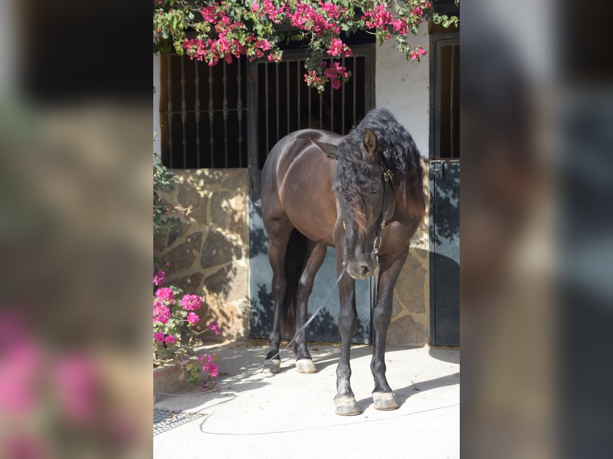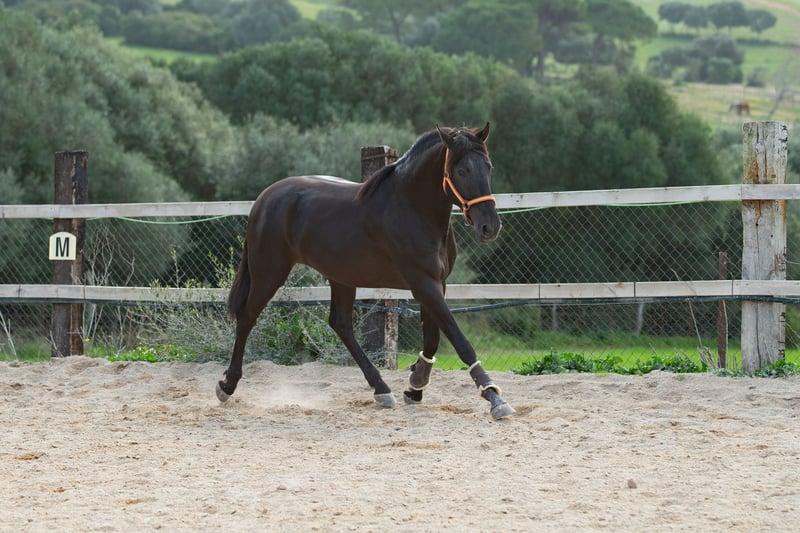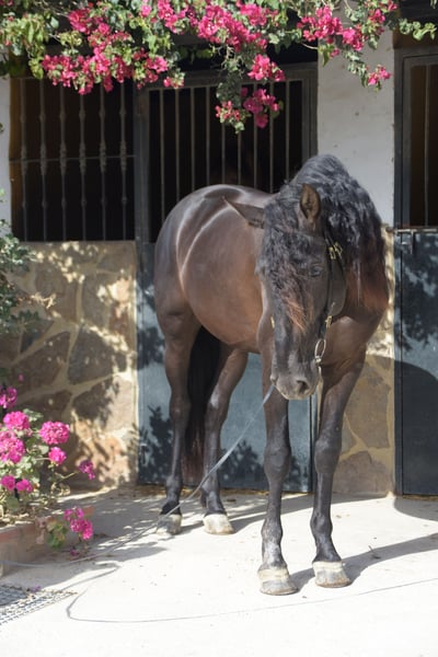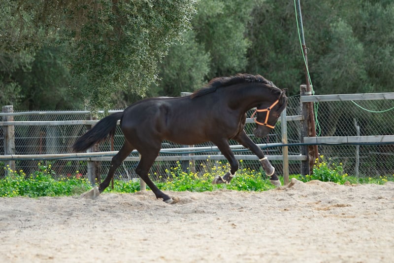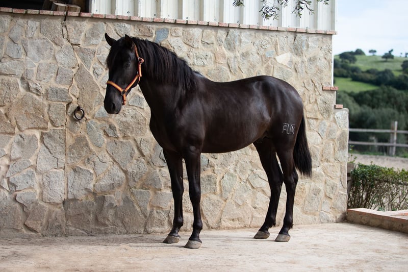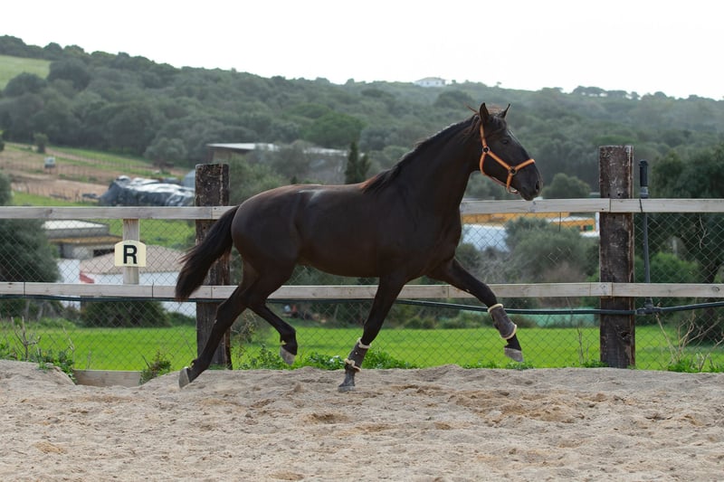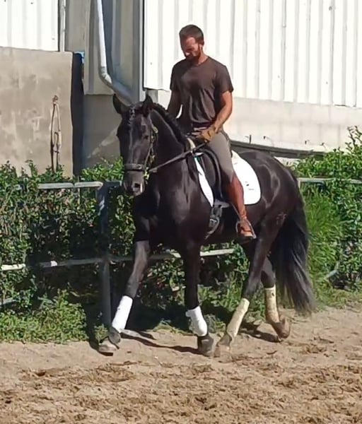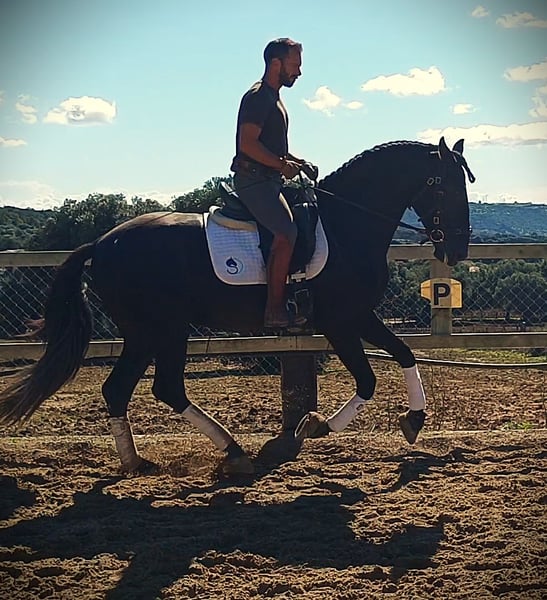 Dieser bildschöne PRE Rapphengst wurde 2020 geboren. Er misst derzeit ca. 1,61m. Schonend wurde er von uns für das Reiterleben vorbereitet. Er wird auf Wassertrense in allen GGA geritten, die Seitengänge, Anfänge Travers, zeigt gute Versammlungsbereitschaft. Freundlich, neugierig, verspielt und menschenbezogen, das beschreibt diesen Junghengst sehr gut. Er zeigt gute GGA mit einem herausragenden Galopp und sehr gutem natürlichen Gleichgewicht und zeigt Talent für fliegende Wechsel Wer einen Rohdiamanten in schwarzer Jacke zum weiter Selbstausbilden sucht, ist hier genau richtig. Er liebt die Freiarbeit, kennt aber auch Stangentraining und die Arbeit an der Hand. Er lernt und versteht unwahrscheinlich schnell. Zu Hause ist er in einer großen Paddockbox mit direktem Kontakt und Anschluss zu anderen Pferden, auch Hengsten. Er ist gewöhnt an laute Maschinen und Fahrzeuge, freilaufende Hühner, Kühe, Hunde und vieles mehr. Röntgenbilder aus 2022 sind vorhanden. Er ist Piro negativ, geimpft, regelmäßig entwurmt sowie dem Schmied vorgestellt. Auf Wunsch kann er vor Ort gelegt werden. Natürlich kann er noch zur weiteren Ausbildung bei uns bleiben. Bei ernst gemeintem Interesse leite ich gerne weitere Informationen weiter. Wir sprechen Deutsch, Englisch und Spanisch. Alle Preise verstehen sich ohne MwSt. und ohne Transport!