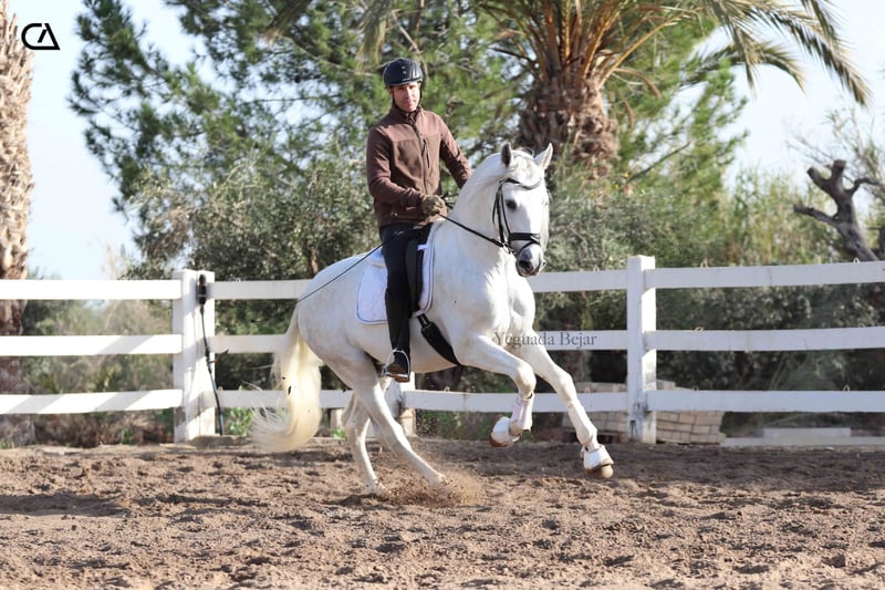 Rufo de Martet es un joven caballo con muy buena conformación y tres buenos aires. Su carácter es muy dócil, amigable y confiado con las personas, haciendo que su manejo sea sencillo. Actualmente, tiene una buena base de doma, acorde a su edad, y es perfecto para paseos, muy tranquilo y fiable. Su genética es muy interesante, es hijo de Lucius de Martet, un espectacular semental de gran raza y belleza, que además compite en doma en nivel San Jorge. Rufo es nieto por parte de padre de Armas Felino (Semental Calificado), quien viene por Lagar (Semental Calificado) ambos de Yeguada Plaza de Armas. Su madre es Jala de Martet, por Manijero IX (Joven Reproductor Recomendado y Semental Calificado), es una yegua con una genética clásica del PRE, con línea Bohorquez y Miura. Rufo puede ser un bonito proyecto de futuro, tanto para competición como para disfrutar en familia.