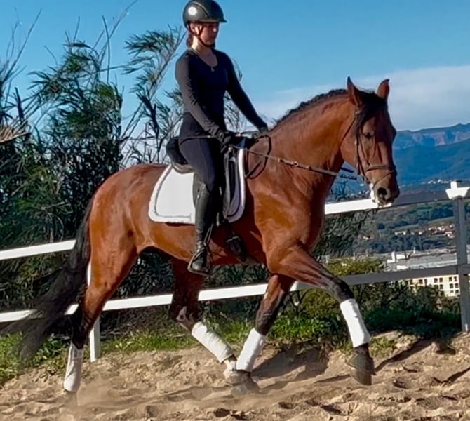 En nombre de un cliente: ¡Eros es un auténtico caballero español! El PRE es absolutamente amable y fiable bajo la silla. Se le monta sobre una buena base - con carraca - y siempre es decente tanto en la pista como en el campo. Debido a su tamaño, Eros también cubre perfectamente a jinetes más fuertes o más grandes y es el compañero ideal para el jinete de ocio exigente. Ni que decir tiene que procede de la mejor ganadería y con todos los papeles de PRE (ANCCE). Ubicación: España - se puede organizar el transporte a cualquier parte del mundo Siempre tenemos alrededor de 50 caballos barrocos y de deporte de alta calidad - montados desde crudos hasta Gran Premio - en nuestra cartera. Si está interesado, póngase en contacto con nosotros o visite nuestro sitio web www.majestic-horses.com