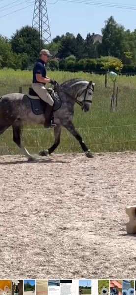I offer for sale a beautiful Andalusian stallion with very good movement in all three gaits. Bombproof. Wonderful character. Very good head. Learns quickly. The horse performs flying changes, leg yields, and shoulder-in. Healthy. Easy to handle (shoeing, grooming). An ideal prospect for a dressage horse or working equitation. I highly recommend it.