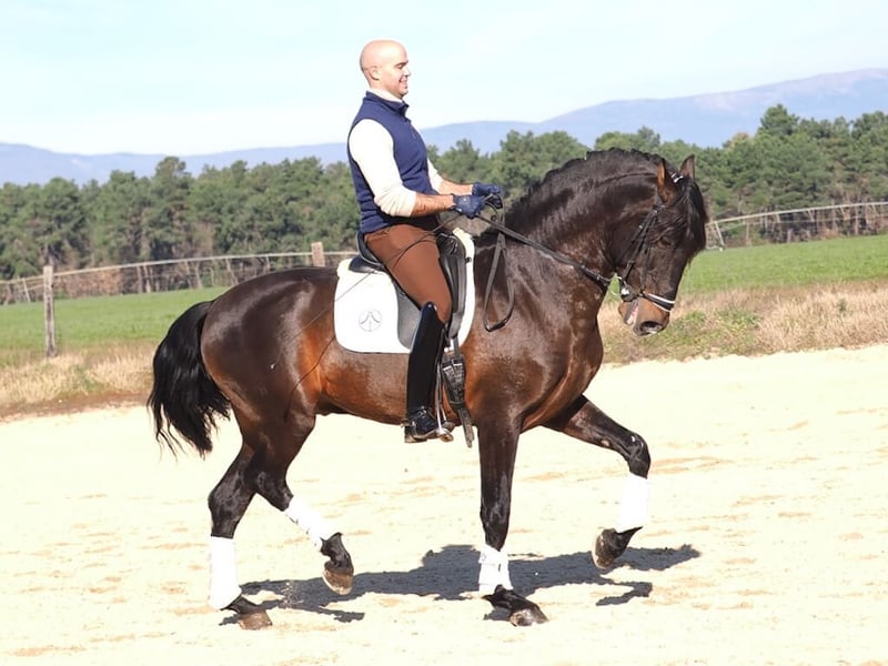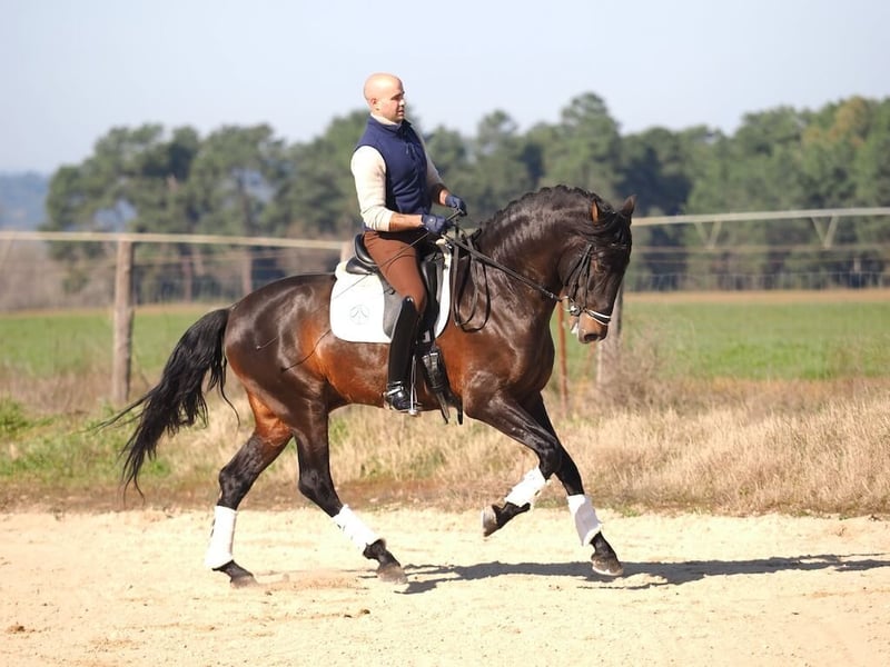 Discover our magnificent Purebred Spanish Horse (PRE), a bay stallion standing 1.67 m tall, with exceptional elegance and beauty. His expansive and rhythmic movement in walk and trot, along with his great potential and strength, make him an ideal choice for dressage. Currently at a medium level, this horse already masters canter half-passes, initiates pirouettes, performs flying changes, and piaffe, demonstrating a solid foundation to continue progressing toward higher levels. Perfect for riders looking for a talented and willing partner to reach the top in competition.