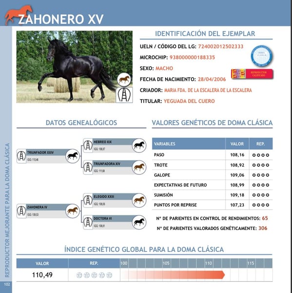 Prenotate il nostro nobile stallone calificado, il cavallo da dressage Zahonero XV, di alta genealogia, M.F Escalera, per la vostra selezione. Con la sua impressionante discendenza, il suo temperamento dolce e il suo movimento elegante, trasmette perfezione in bellezza, intelligenza e maneggevolezza. I suoi discendenti si distinguono per un’estetica armoniosa, giri espressivi e ottima propensione all’apprendimento. Zahonero XV: 100% M.F. Escalera, genetica nera, CALIFICADO, stallone approvato! (Semen in congelato disponibile!) Zahonero XV è un stallone di straordinario tipo, con una presenza molto particolare. Possiede un’esteriorità sportiva ed elegante, corretta. La sua eccellente maneggevolezza si evidenzia in un passo molto ampio, un trotto potente e un galoppo ascendente. Non a caso, questo stallone calificado ha superato la selezione con voti eccellenti. Nel mondo, in questa categoria, esistono solo due stalloni neri, allevati dal rinomato allevamento Maria Fernanda de la Escalera. La sua alta qualità di saddle performance, la genetica di prima classe e il carattere straordinario lo rendono uno dei migliori stalloni della selezione PRE. Un eccellente cavallo da dressage, che si distingue per le prestazioni sportive e brilla nelle prove di funzionalità. Dal punto di vista riproduttivo, Zahonero XV, figlio del leggendario Triunfador XXIV, residente negli USA, è sinonimo di performance e bellezza. Triunfador XXIV ha prodotto finora 47 discendenti approvati, di cui 14 premiati con medaglia d’oro e quattro stalloni calificado. È stato tre volte finalista SICAB tra i primi cinque e vincitore di medaglia d’oro a Siviglia e Jerez. Il suo nonno, Hebreo XIX, plurimedagliato d’oro, finalista SICAB e figlio del leggendario Macanuo III, è uno stallone Escalera che ha scritto la storia. La nonna di Zahonero, Triunfadora XIV, iscritta nel “Book of Merits”, vanta numerosi finalisti SICAB tra i discendenti. È figlia di Nadadora VIII, che nel 1991 e 1994 fu vincitrice SICAB in Spagna, e due volte campionessa nazionale di movimento e sette volte medaglia d’oro SICAB, più di qualsiasi altro P.R.E. nella storia. Zahonero ha ricevuto numerose medaglie d’oro e d’argento in Spagna ed è stato più volte partecipante al SICAB · Salón Internacional del Caballo PRE di Siviglia. Ordina ora e porta la tua selezione a un livello superiore! Per ulteriori informazioni o domande, non esitare a contattarci.