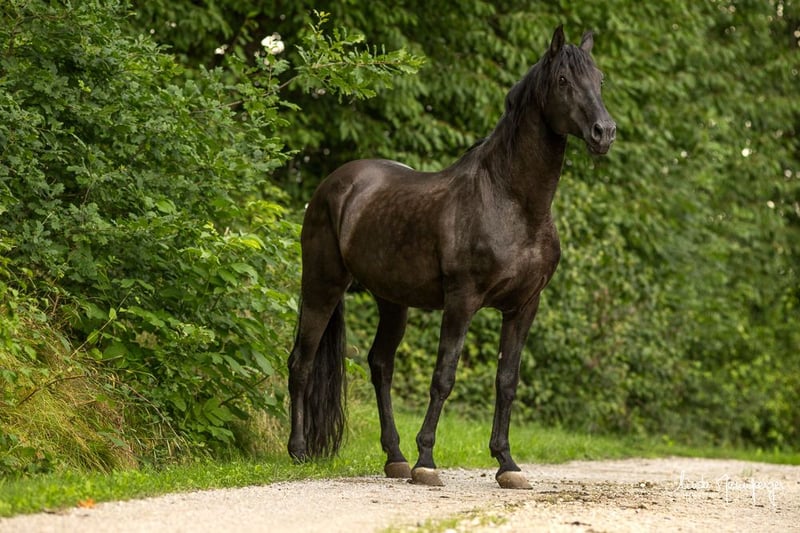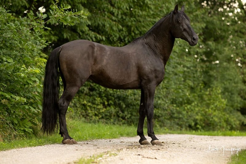 Our Dragon UCO licensed PRE stallion with Ancce papers, is available this year to foreign mares for mating on the hand. He is 1.65, black and carries the prl gene. His sire is one of the oldest known prl sires Urgente. On his part, he went purely Yeguada Militar. Dragon already has some descendants, pictures of his chic, baroque, 4 year old son Faruco can be shown. With us Dragon stands in a paddock box between our mares who are in the open stable. He is completely calm and decent. He is fine and careful in handling. His gentle, sweet calm eyes speak volumes about his character. He brings a strong, stable physique, as you would expect from a baroque PRE. He stands on strong and stable legs, like hooves. Unfortunately, we had to cut out his mane because of matting, but it is already growing very dense and beautiful and will be very long. He still has white hair. If you have any further questions, please do not hesitate to contact us.