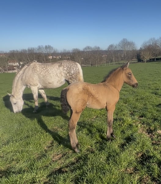 🔆Quercus🔆 Male foal, Lusitano cross with PRE (Andalusian) Born on February 22, 2026, weaning expected at the end of the year. Coat color: Isabelle 🔅Sire: Nelson MSL – purebred Spanish horse 🔅Dam: Easy – Lusitano type Expected height at maturity: approximately 16.1 hh. 🔆 Quercus has a very expressive head. He is a lively foal! He has a fantastic temperament. A true warrior spirit. He is lively, curious, and intelligent. This horse will be ideal for sport, dressage, or leisure riding. He will be sold handled and with basic ground training (leading, grooming, trailer loading). Will be microchipped, vaccinated, dewormed, and trimmed. Transport possible. 🔆 Currently available for reservation with flexible payment options until weaning. 📍Viewings in Haute-Vienne (87), just 15 minutes from Limoges. Feel free to contact me for more information, photos, videos, or to arrange a visit.