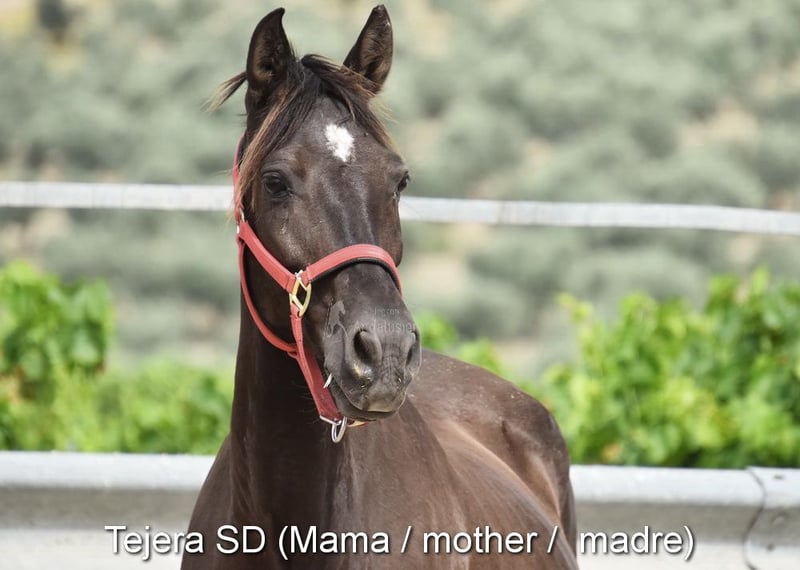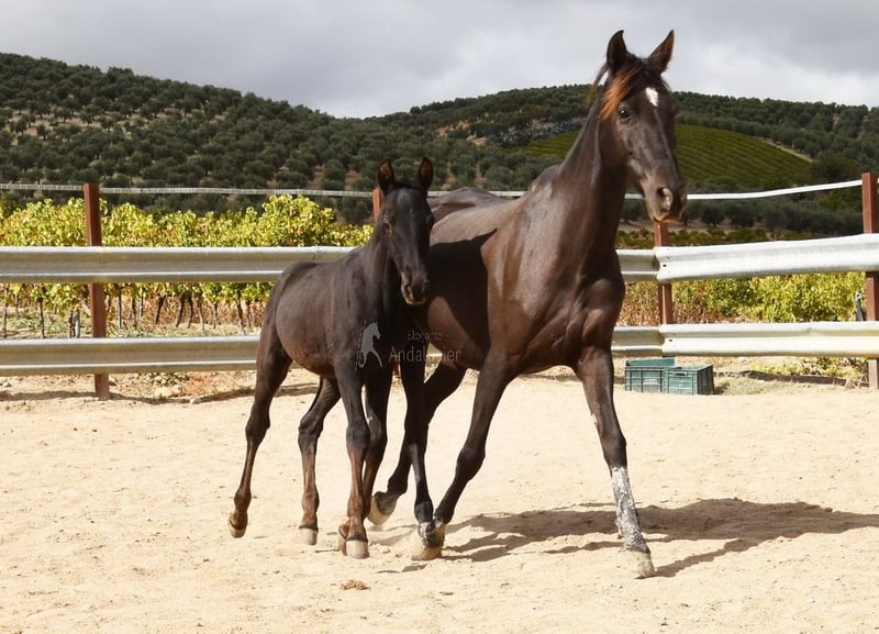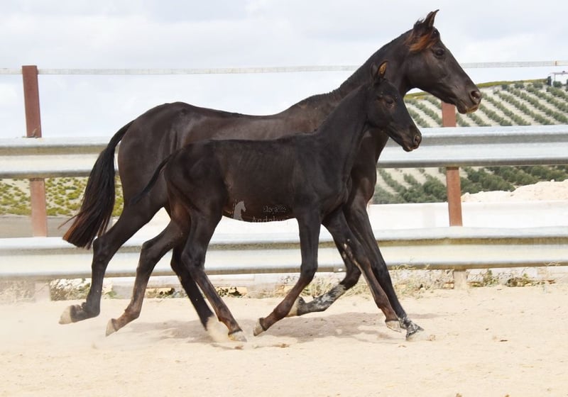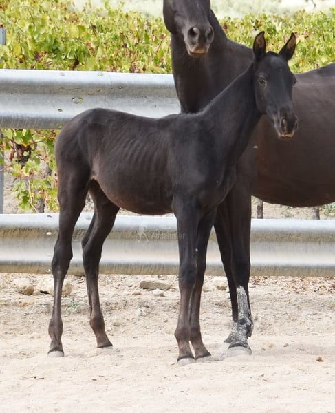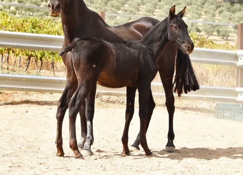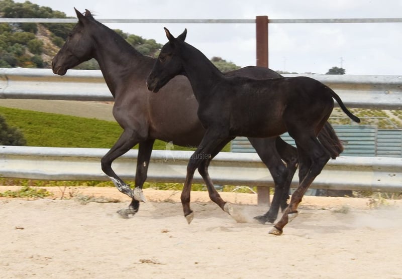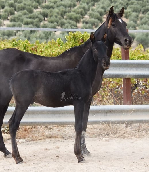 caractère doux, curieux, brut, se tient dehors avec sa mère et d'autres juments et poulains, grand, couleur spéciale, noir avec gène PRL, ascendance : Antonio Guiral Guarga, Hnos Pina, Señorio de Bariain, Bohorquez www.elegante-andalusier.com