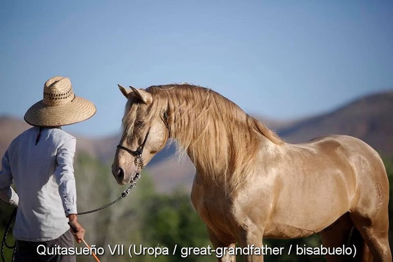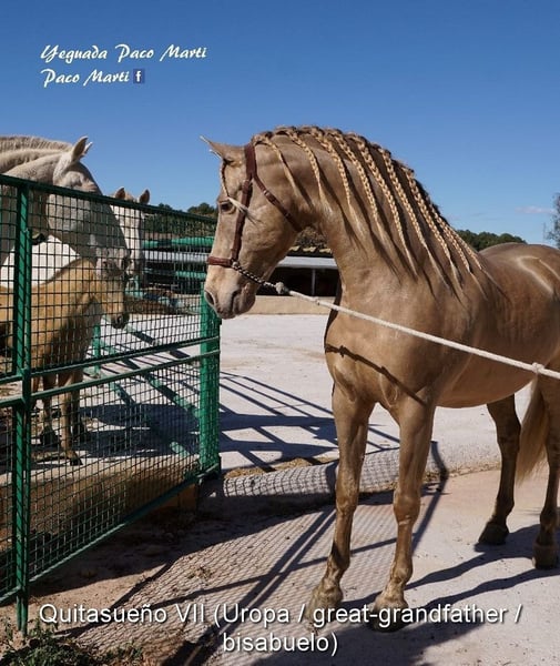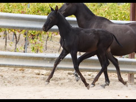 łagodny charakter, ciekawski, nieoszlifowany, stoi z matką oraz innymi klaczami i źrebakami na zewnątrz, duży, specjalny kolor, czarny z genem PRL, pochodzenie: Antonio Guiral Guarga, Hnos Pina, Señorio de Bariain, Bohorquez www.elegante-andalusier.com