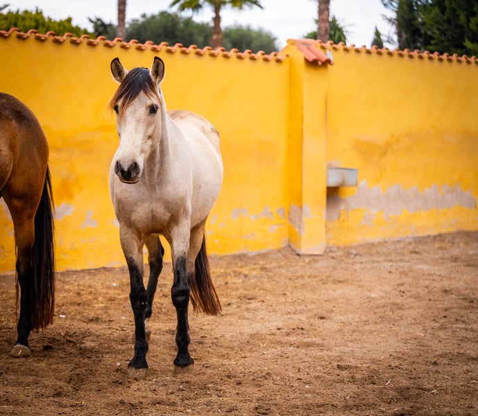 Mare gravida: Giumenta da allevamento gravida coperta da stallone Isabelo. È alta 165 cm e ha un carattere molto affettuoso. È naturalmente approvata e ha già dato alla luce puledri sani. Maggiori informazioni su: www.caballoria.com