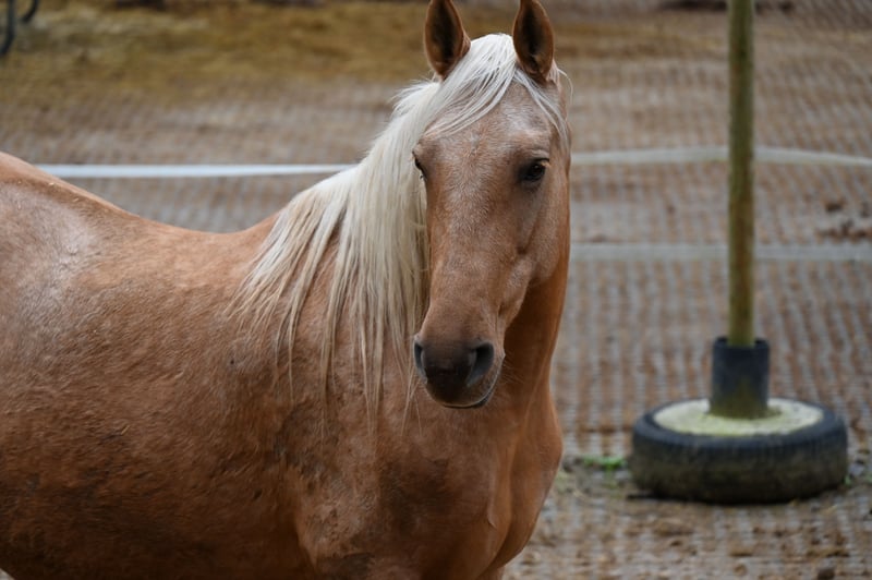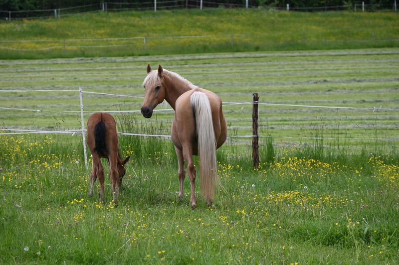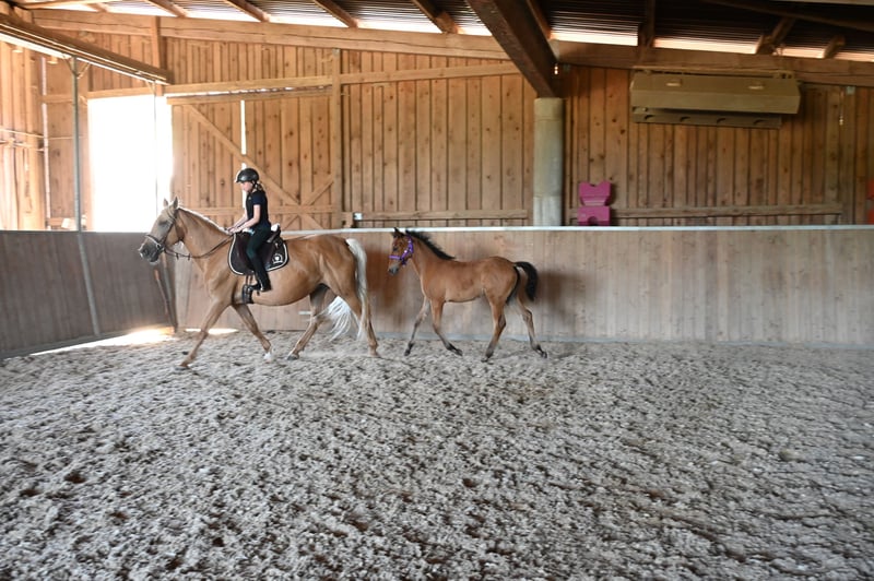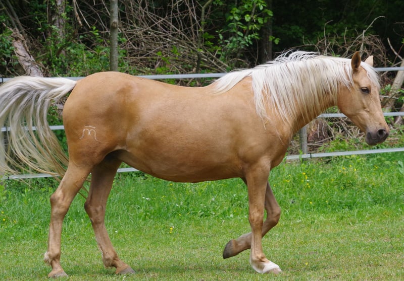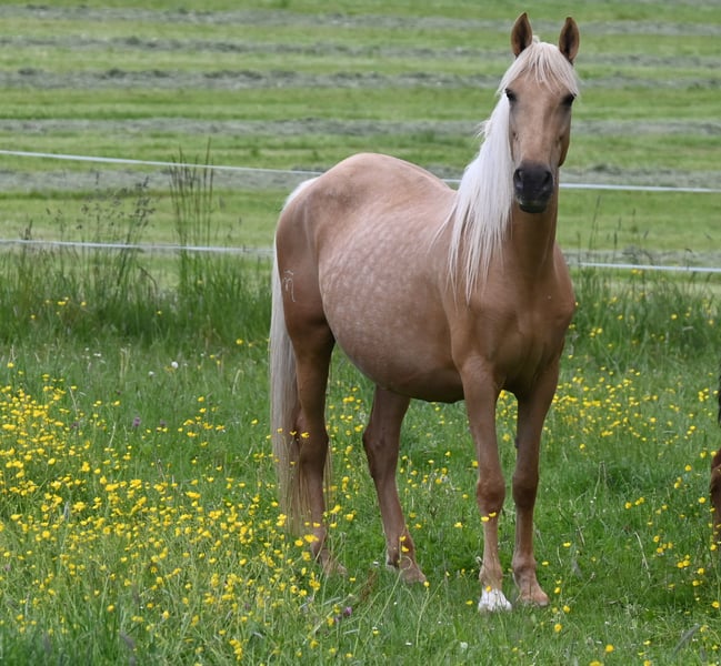 Mar Wendolina was born on June 16, 2014, in Spain. She is a PRE mare in the color Palomino, with the genetic code: gg Aa ee CrC PP. Wendy is 163 cm tall and is registered and approved with the Global Genetic Index: 99.39 at ANCCE. Wendy's father is the well-known Revoltoso XXXIX by Paco Marti. Both sides of Wendy's pedigree trace back to Yegada Militar. Additionally, she has Carthusian blood on her father's side, which is reflected in her strong nerves and clear-headed character. Wendy is absolutely well-behaved and well-mannered. She is an excellent mother. So far, she has had 4 foals: one chestnut colt and three cremello fillies. Wendy is ridden and has a very expansive walk and trot. She is popular among riding students because she is friendly and always tries to do everything right. Wendy also enjoys liberty dressage. She has her fifth foal at foot and is in foal for spring 2026 to Flamenco. She is good for the farrier and loading. Mother: Templaria VII, Father: Revolotos XXIX, Maternal Grandfather: Genro