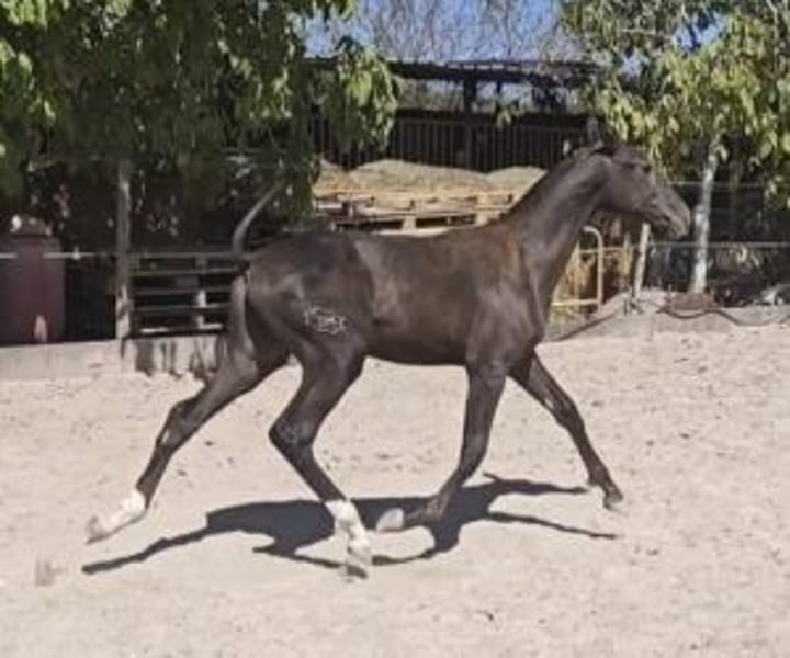 Black and elegant: bet on her, you have everything to gain. This filly is not just any old filly. She's the kind of mare who, if someone takes her training seriously, will make people talk about her. She possesses ample, expressive smiles, with a natural rhythm that already allows us to imagine her on a track in a few years, well-crafted, assertive, making a difference. And the most interesting thing is that she's still a complete work in progress. A sound filly, without flaws, without bad habits to correct. Ready to be shaped from the ground up. Her origins are very interesting, both functionally and morphologically. And this is evident in each of her movements. She has structure, drive and a real presence. She comes from a father measuring 1,68 m and a mother of 1,72 m, several times medalist in morphological competitions. It is therefore highly likely that she will take a lot of sizewhich makes her even more valuable for an ambitious project. That is why we particularly recommend her to a professional or experienced horse rider who wishes to raise their own mare and train her to their own liking from the start. And one crucial point: she has already passed the genetic test for coat. Phenotypically, she is black. And genetically: 🧬 gg aa ee CC NN Which means : She will never produce grey (gg), nor diluted coats (CC NN) She always transmits the "a" gene (recessive black). She can produce black foals if the standard provides E Also chestnuts (if the cross produces ee) And bays/browns if the stallion brings A No uncertainty. Everything is clear from the start. If you are looking for a medium-term project, with a mare that will offer you not only a great training experience, but also a solid foundation for breeding… so this filly deserves your full attention. At IberHorse: We select horses with high standards and a long-term vision. If this profile matches your project, contact us to arrange a viewing. Sometimes, great mares begin with a smart choice.