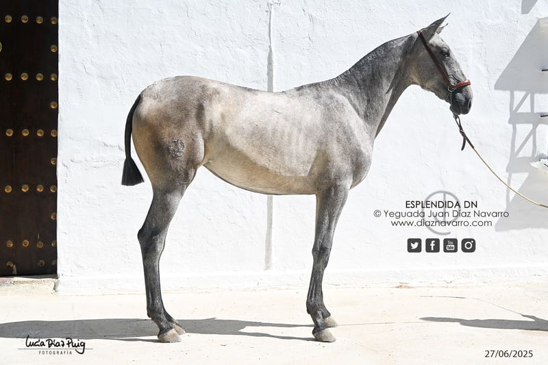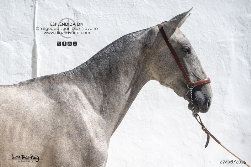 ¡Oportunidad de adquirir una bella y prometedora yegua! https://diaznavarro.es/esplendida-dn Se ofrece en venta una preciosa PRE, de raza pura, nacida en el año 2024. Es una yegua de color tordo picazo, con un aspecto impresionante y una presencia destacada. Ideal para quienes buscan un ejemplar de calidad, con potencial para doma, monta o cría. Nació de capa castaña. Futura potra de concurso. Muy movida. Líneas: Marco Antonio, Velero XI, Deco, Llamativo II, Colombiano III. Ventura Camacho, Granda, Yeguada Militar, Vizconde de la Montesina, Fernández Daza, Urquijo, D. Benito Zoido, Bohorquez. No pierda la oportunidad de conocerla y valorar todo su potencial. Para más información, no dude en contactarnos.