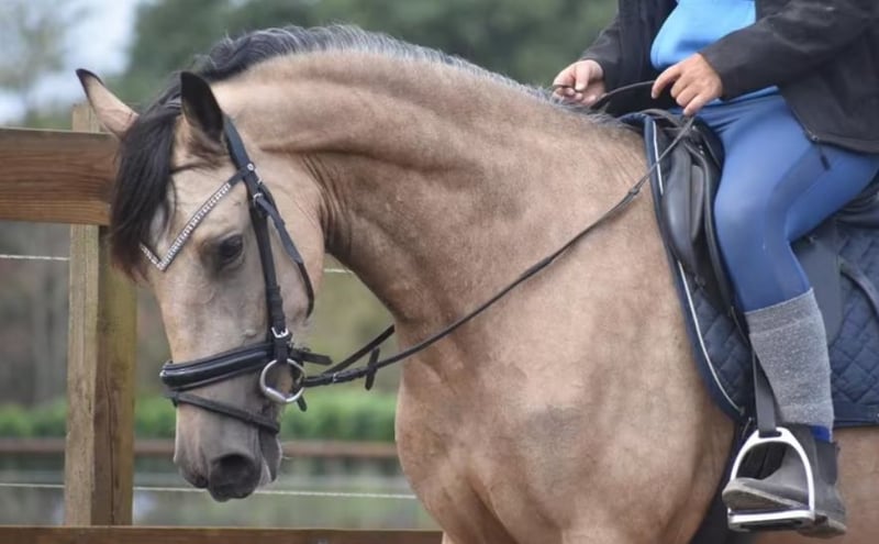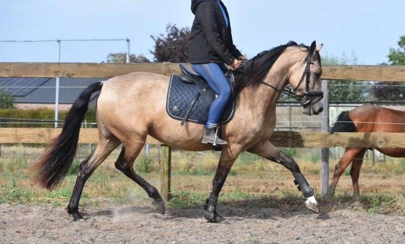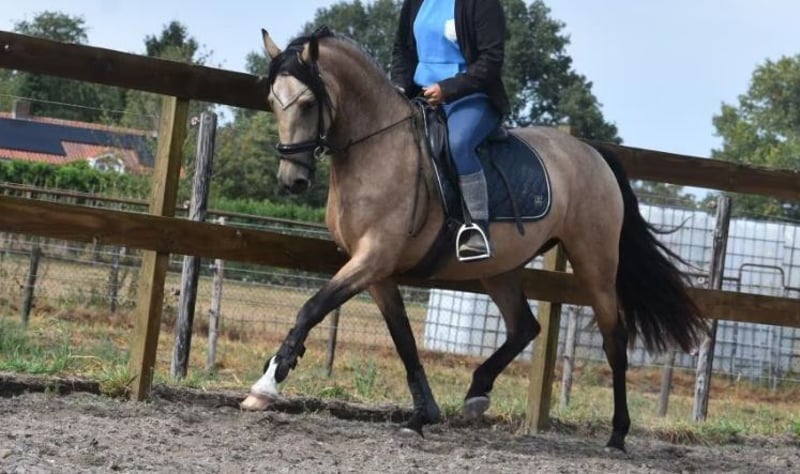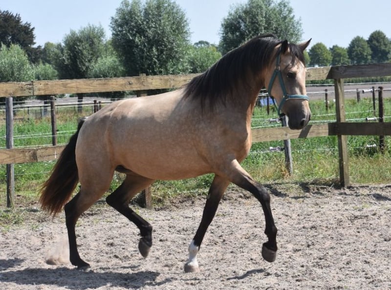 Ze is ons gegund door haar vorige baasje, voor wie ze toch iets te klein is gebleven. Maak kennis met Abril CX, een werkelijk prachtige PRE die zo uit een sprookje lijkt te komen. Ze is 3,5 jaar oud en ca 158 m hoog. Ze heeft een prachtige afstamming van Caramelo CXLIV x Poderio III x SEIS II. Ze was 1 dag te vroeg , anders was ze Apta goedgekeurd. Haar schitterende valkkleur, Buckskin maakt haar extra bijzonder (getest: Aa, Ee, CCr). Ze kan zeer bijzondere kleuren vererven. Deze rapporten zijn aanwezig, evenals haar totaal correct ingevulde Carta de propiedad. En laat haar karakter nou eens net zo mooi zijn als haar uiterlijk….. Er is veel grondwerk met haar gedaan, ze is super opgeleid en zadelmak gemaakt. Leuk detail is dat haar vorig baasje met een gewoon paard van Stal Doorstap het heeft gebracht tot ZZ Zwaar! Abril is hier mega fijn te rijden, zowel door minder ervaren ruiters als door gevorderden. Ze geeft hier altijd een fijn gevoel en denkt echt mee met haar ruiter. We rijden haar hier zelfs op straat langs groot verkeer. (Blijft natuurlijk altijd een risico, zelfs zonder paard)… Ze is recent gekeurd waarbij ook goedgekeurd voor de sport incl. bloedafname Haar vorige eigenaresse vertelt dat ze bekend is met grondwerk en zelfs als examenpaard voor opleidingen is gebruikt. Daarnaast heeft ze een trailerlaadcursus afgerond. Abril staat graag bij andere paarden buiten, maar kan ook op stal. Ze heeft liever gezelschap en is dol op veulens en kleine pony’s. Ze heeft haar volledig röntgen laten keuren op benen, hals en rug. Ze staat vanaf april 2024 in Nederland en is vanaf dat moment dagelijks in de hand geweest. Haar oom heeft het geschopt tot Intermediair I en Masters in de Working Equitation. De vorige eigenaresse wil graag contact houden met de nieuwe baas. Ze heeft kaarten met tekst voor deze. Welke geluksvogel wordt de nieuwe eigenaar van deze sprookjesachtige parel?