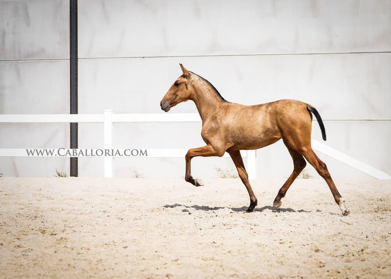 Foal: Pura Raza Espanola Filly Born in a radiant Buckskin hue, this young foal embodies the quintessence of beauty and elegance. With a full and impressive paper confirming her noble pedigree, she stands as a testimony to excellent horse breeding. Their movement patterns are a real feast for the eyes. Every step she takes exudes grace and power, making her an ideal candidate for dressage competitions. Her parents, both large-framed, passed on to her not only her impressive stature but also her outstanding temperament. This filly is not only predestined for dressage, but also perfect for breeding. With her genetic excellence, she could produce the next generation of top horses. For those who are looking for a reliable and elegant leisure partner, it also offers the perfect package.