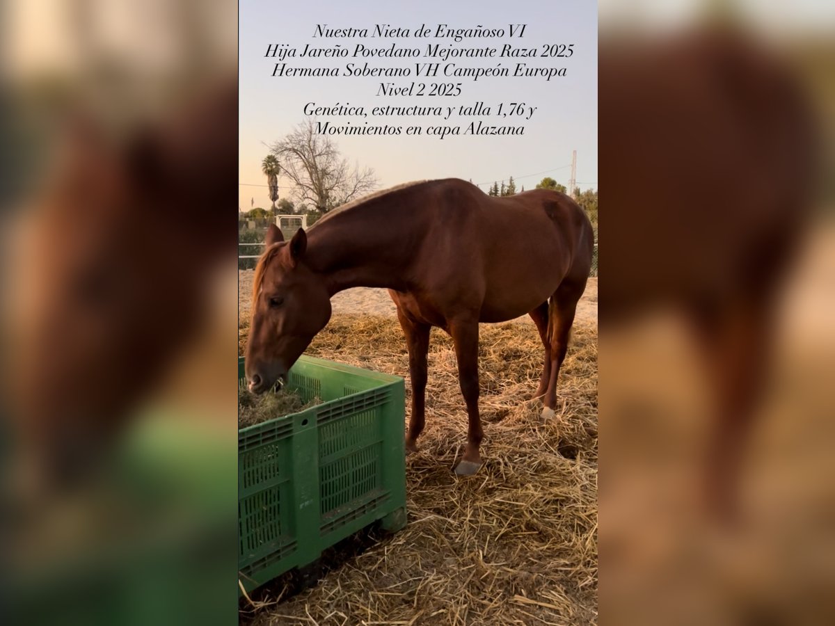Yegua PRE Alazana de 4 años y medio con estructura, alzada 1,76 y movimientos demostrables. Actualmente preñada de semental palomino Batanero rb (alzada 1,80) para parir en marzo de 2026. A destacar su estructura, talla y movimientos en capa alazana, muy correcta morfológicamente. Valoración de apta reproductora con muy buenas reseñas.
