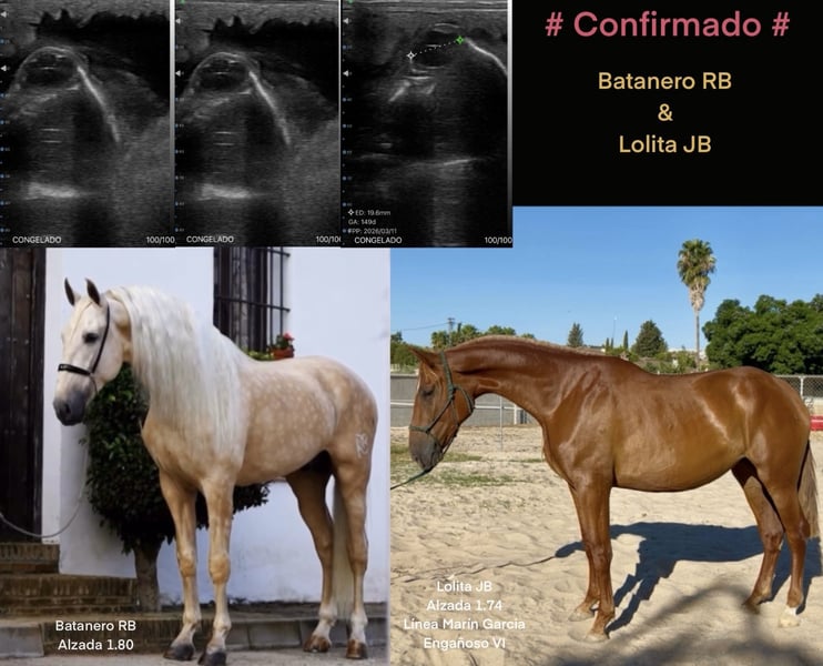 PRE-Stute, alazana, 4,5 Jahre alt, mit guter Körperhaltung, einer Größe von 1,76 m und beweisbaren Bewegungen. Derzeit tragend von einem palomino Hengst, Batanero RB (Größe 1,80 m), voraussichtlich im März 2026 zu gebären. Besonders hervorzuheben sind ihre Körperstruktur, Größe und Bewegungsqualität, die bei Tieren mit alazaner Färbung selten zu finden sind; sie ist morphologisch äußerst korrekt. Sie wird als geeignete Zuchtstute bewertet und erhält sehr positive Bewertungen.