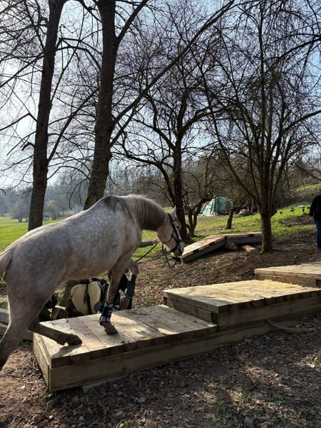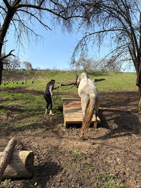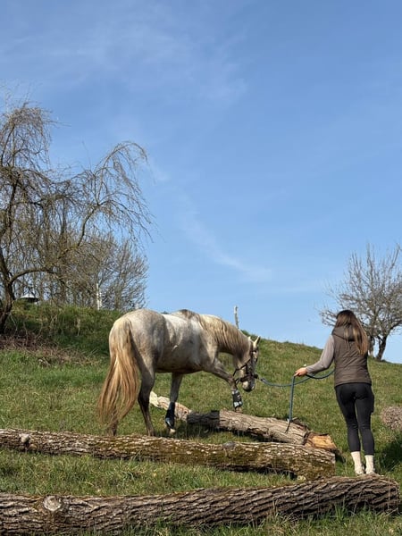 Stunning PRE Grey Mare – Reliable, Brave & Affectionate For sale is an elegant PRE mare, born in 2020. This young lady impresses not only with her presence but especially with her wonderful character. She is an absolute dependable partner: having already participated in a fire safety course, she confidently handles extreme trail obstacles and remains calm and steady in desensitization exercises. Going out alone into the terrain is no problem for her – she is completely trail-safe and trustworthy. In the riding arena, she calmly performs all three basic gaits and shows a strong willingness to learn and motivation. She wants to please her rider and works attentively. However, she is not suitable for complete beginners – she still enjoys learning and needs to be challenged. In handling, she is particularly affectionate, cuddly, and people-oriented – a true heart mare. An ideal horse for anyone seeking a reliable partner for leisure riding, trail, and further development. Serious inquiries are welcome – we look forward to hearing from you!