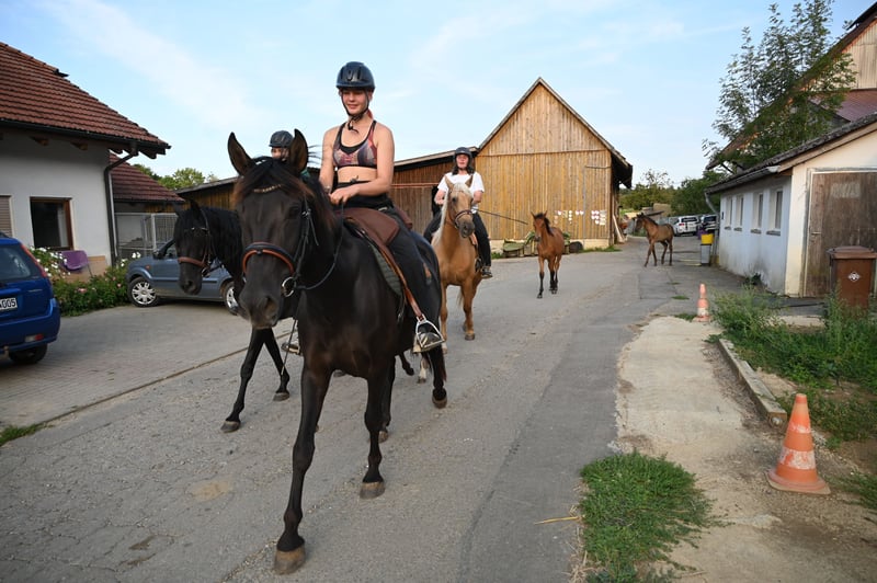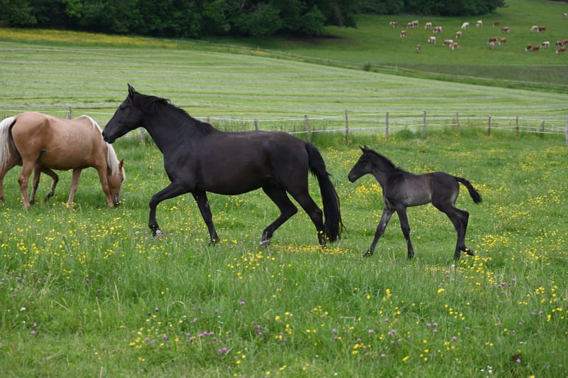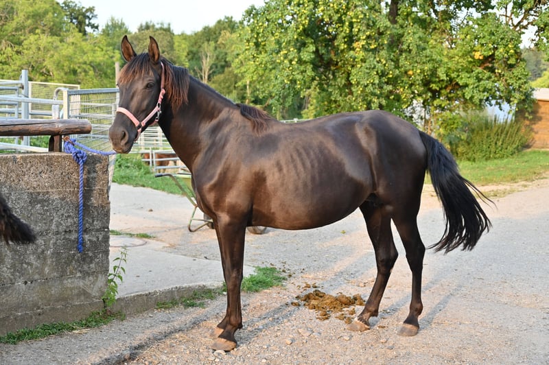 Macarena de Lucia is a 5.5-year-old PRE black mare with pure Escarlata lineage. Her breeding index is 98.31%, and she is a homozygous mare for the black color EEaa. Currently, Macarena stands at 159 cm tall, and it is likely that she may grow another 1 or 2 cm. She is very strong-minded, affectionate, and friendly. Macarena is ridden both in the arena and on trails, where she demonstrates good behavior with a pleasant forward drive. So far, she has had 2 filly foals, one of which she is still nursing until September; the births went well. The Escalera line is one of the oldest bloodlines in Spain and is the result of a consistent breeding program by a family that goes back more than 200 years. A notable characteristic of Escalera horses is their high willingness to perform, baroque, noble horses with physical strength, good rideability, and outstanding movements. The foundation of Escalera horses consisted mainly of brown mares, with few exceptions of blacks, which were then paired with the best and most athletic stallions from the Yeguada Militar. For this reason, Escalera horses are particularly suited for dressage and consistently rank high at various breeding shows. Macarena is vaccinated, regularly dewormed, and in excellent health. She is familiar with farm machinery and other farm animals as well as playing children, and she is good for the farrier and loading. After the birth of her foal, she was checked by an osteopath. Her daughter Hermosa Perla Negra can be weaned starting in September. Sire: Escogido XXIII Dam: Manzanillo XII