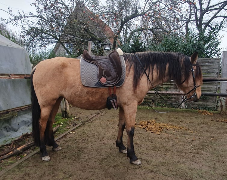 Zum Verkauf steht eine 6-jährige Falbstute mit wahnsinns Behang der Rasse Pura Raza Española, die mit ihrem charmanten Wesen und ihrer vielseitigen Veranlagung begeistert. Mit einem Stockmaß von 1,57 m vereint sie Eleganz und eine kräftige Statur. Diese außergewöhnliche Stute ist fein in der Bodenarbeit und wurde mit drei Jahren sanft angeritten. Sie verfügt über drei raumgreifende, sehr bequeme Grundgangarten. Nach ihrer Ausbildung hat sie erfolgreich zwei Fohlen aufgezogen und sich dabei als tolle und fürsorgliche Mutter erwiesen. Aktuell wird sie, aufgrund der Trächtigkeit, leicht geritten. Das Besondere an ihr Unsere Stute ist nicht nur eine Schönheit, sondern auch eine Bereicherung für jede Herde. Sie ist sozial verträglich und unkompliziert im Umgang. Natürlich super brav beim Schmied und geht problemlos auf den Anhänger. Jetzt kommt der super Bonus: Sie ist tragend von dem Quarter Horse Hengst "Silver Prime" für ein Azteca Fohlen (Papier aus den USA oder Mexico möglich), das Ende April 2026 erwartet wird. Durch die genetische Kombination bestehen nur die beiden Sonderfarben, Silver Bay oder Silver Buckskin. Die letzten Fotos zeigen den Vater des zukünftigen Fohlen Diese Stute ist ideal für Züchter da sie einfach in der Herde ist, tolle Fohlen völlig unkompliziert zur Welt bringt und problemlos aufnimmt.