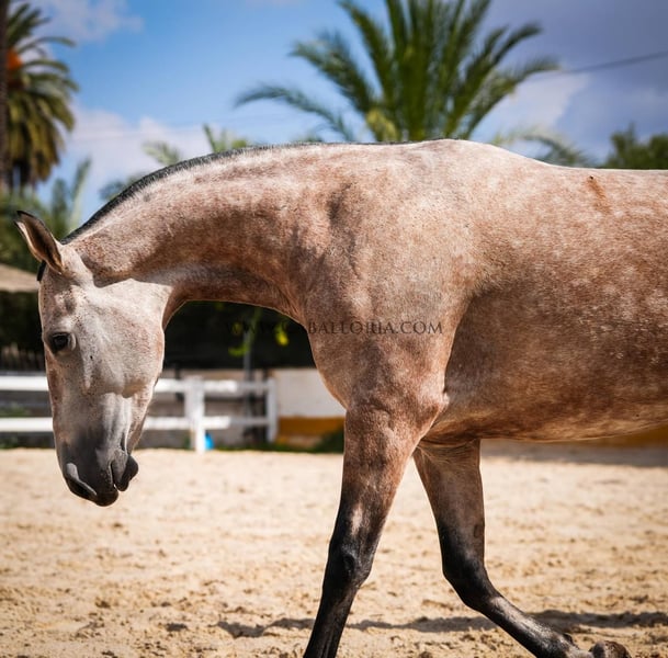 Breeding: We are pleased to introduce you to an impressive PRE red grey mare from the 2019 vintage. With a current height of 164 cm, she impresses not only with her impressive size, but also with her unique genetics. She carries a Pearl Gene, a rare and sought-after color genetics that makes her a real eye-catcher. The mare shows herself in beautiful baroque lines, which are typical for the PRE breed. Her muscular appearance, combined with elegant and expressive movements, make her an ideal choice for growers. Their gaits are fluid and harmonious. For those who are looking for a young horse that is willing to learn and grow with them, we offer the possibility to purchase the mare already ridden for an extra charge. This not only gives you a valuable horse for breeding, but also a horse that has already gained some experience in working under saddle. Finally, we would like to emphasize that this PRE red grey mare not only convinces with her external qualities, but also with her balanced and friendly nature. She is always willing to learn and cooperative, making her a wonderful choice for ambitious breeders as well as lovers of the PRE breed. Take the chance and get to know this gem better. A horse that knows how to convince in every respect with its colouring, its gaits and its character.