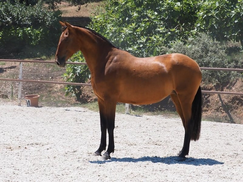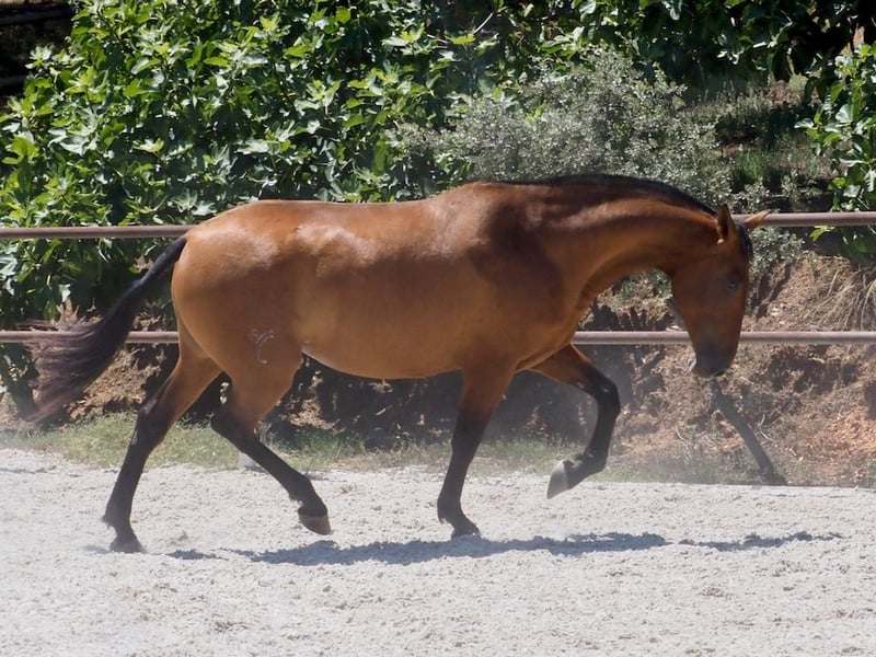 We share with you this marvellous bay mare, granddaughter of Remache XIII, qualified stallion and improving breeder in the paternal line, and grandson of a very moving qualified mare of bay color. On the maternal line, we also have important descendants, such as her grandfather DUQUE CXIII, elite breeder of the Yeguada de las Arenas, or her grandmother, qualified breeder of the Yeguada J.F.Miño S.L.. With a correct morphology, she is a mare with very good poise, her movements are ample both in trot and canter, but she also has an outstanding walk. An interesting bet, for those who are looking for a young mare, to breed horses with a future for dressage.