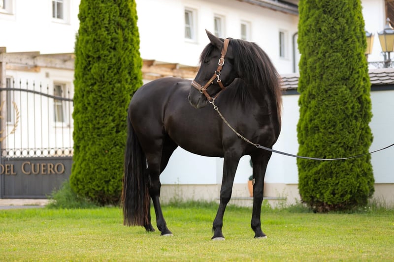 Elegance and top-class pedigree, bred at Yeguada del Cuero (Austria) Nobleza del Cuero is an extraordinary mare, a prime example of quality and character. She comes from the best Spanish bloodlines and embodies genetics that set standards in both conformation and temperament. 👉 Sire: The calificado stallion Zahonero XV (M.F. Escalera), a powerful representative of the baroque line, son of the legendary Triunfador out of Triunfadora and Hebreo XIX. Zahonero represents expression, performance, and inheritance power. 👉 Dam: Our impressive broodmare Selenita V, an imposing and expressive mare of stallion type. Selenita is the daughter of the famous Desdemono-N, a calificado and mejorante stallion in bay color, known for his enormous presence, performance, and excellent breeding quality. His maternal line traces back to Desdemona of the Yeguada Militar – a guarantee of type and nobility. Excellent conformation: Elegantly shaped, harmonious with a powerful foundation. Dreamy movements: Expressive, energetic, with plenty of reach and natural collection. Noble character: People-oriented, willing to work, and balanced – a perfect combination of gentleness and inner fire. Nobleza del Cuero is not only an impressive appearance but also a promising candidate for breeding and demanding training. If you are interested, we look forward to your message. Further information, pictures, and videos are available upon request.