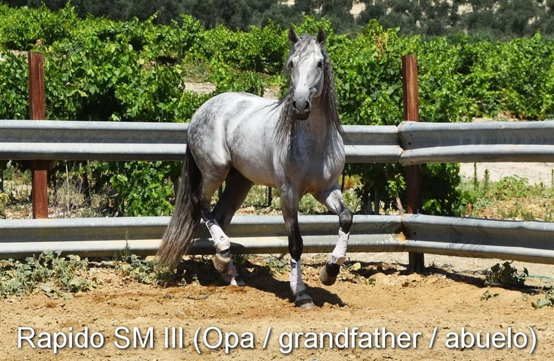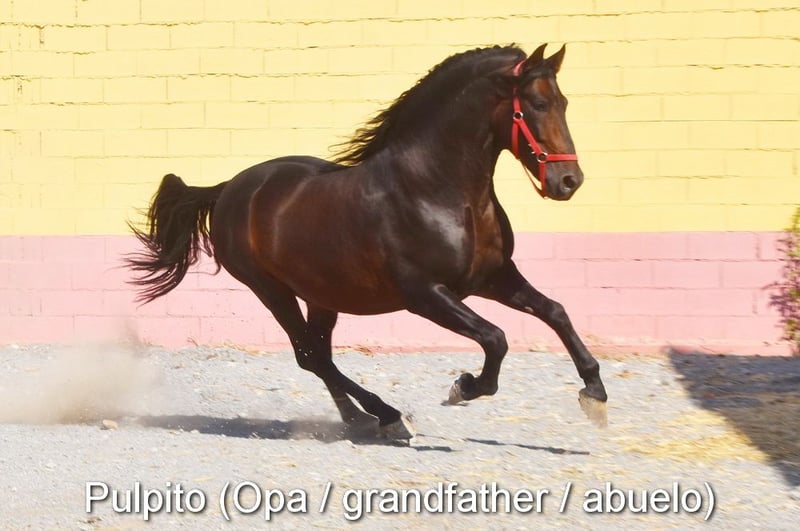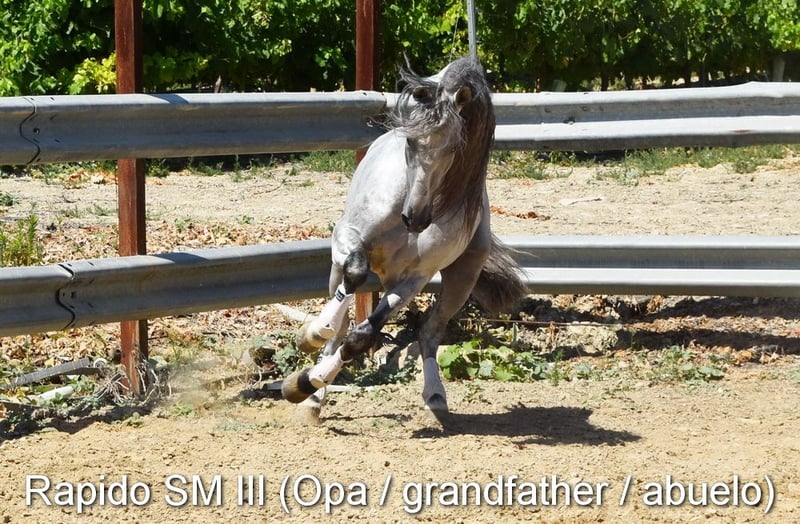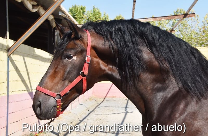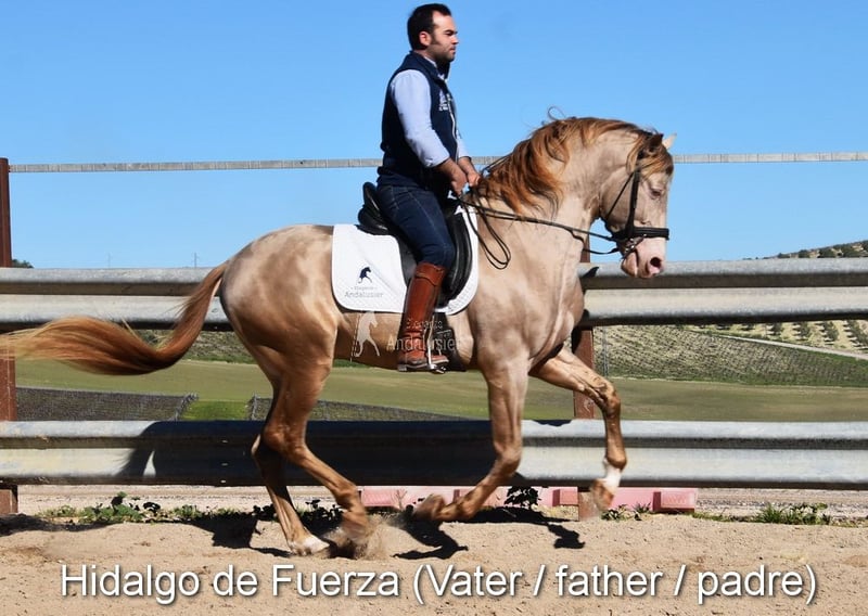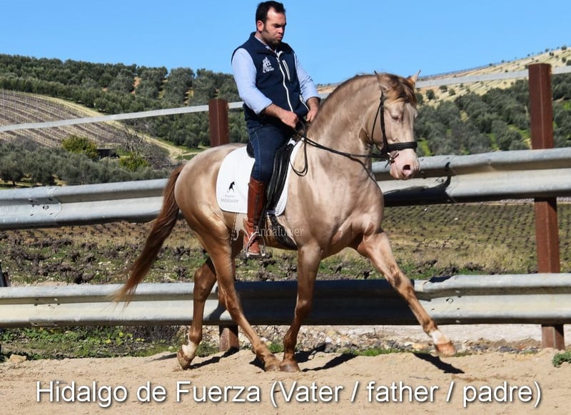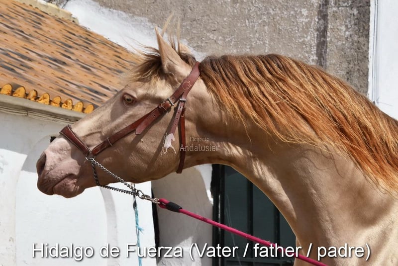 Caractère doux, curieuse, un peu sauvage, elle vit à l'extérieur avec sa mère, d'autres juments et poulains. Bonnes allures, couleur particulière : palomino avec papiers PRE. Ascendance : Antonio Guiral Guarga, Castillo Villafranca, Paco Marti, Pedro Carmona Aguilar. www.elegante-andalusier.com