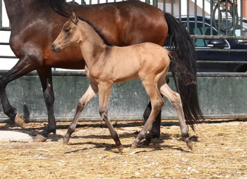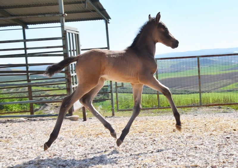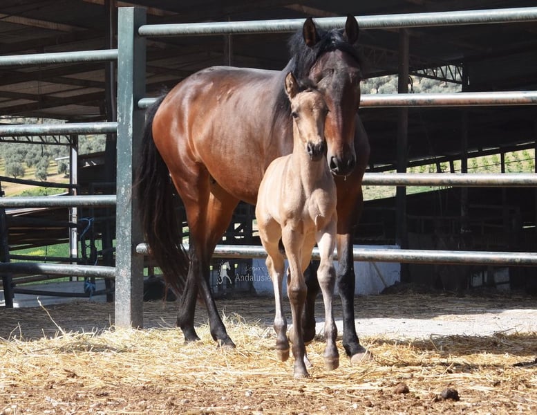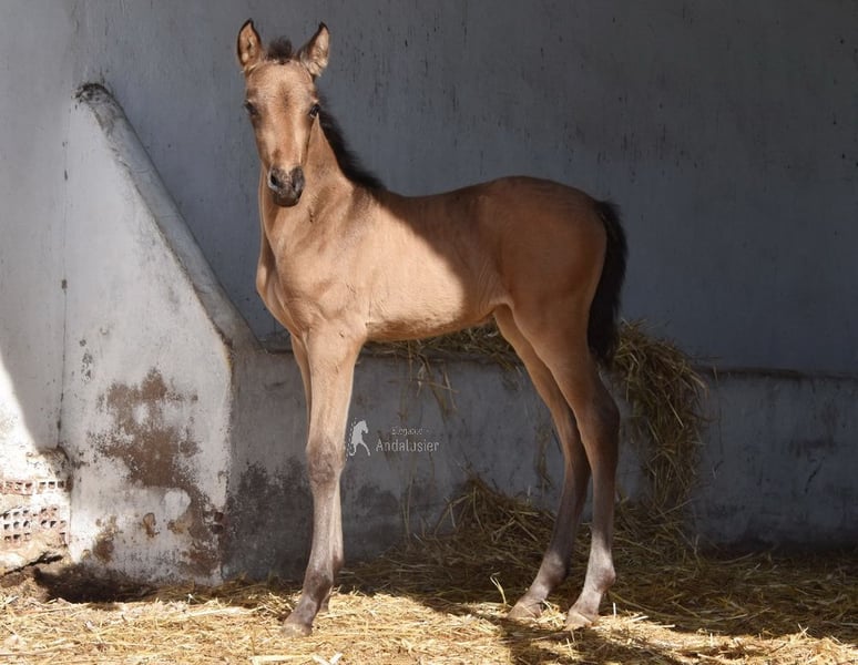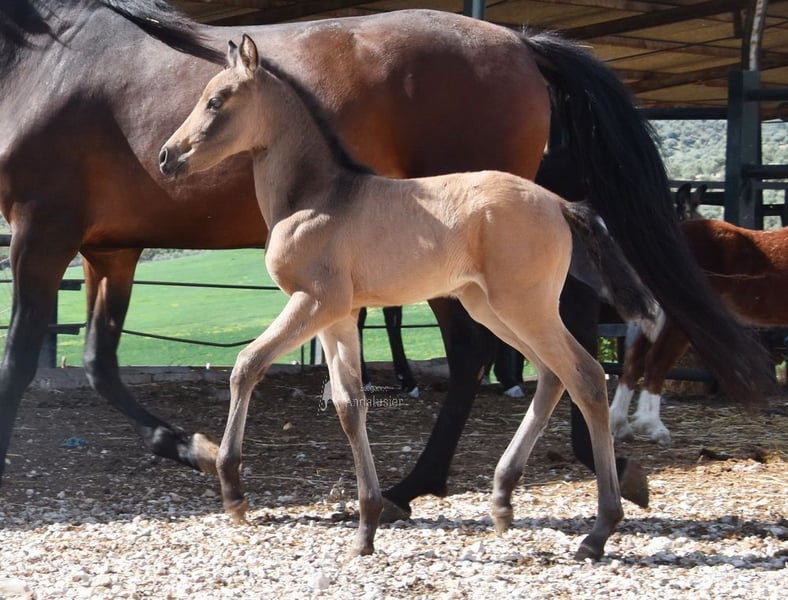lieber Charakter, neugierig, roh, steht mit ihrer Mutter und anderen Stuten und Fohlen draußen, gute Bewegungen, spezielle Farbe, Falbe mit PRE Papieren, Abstammung: Antonio Guiral Guarga, Castillo Villafranca, Paco Marti, Pedro Carmona Aguilar www.elegante-andalusier.com