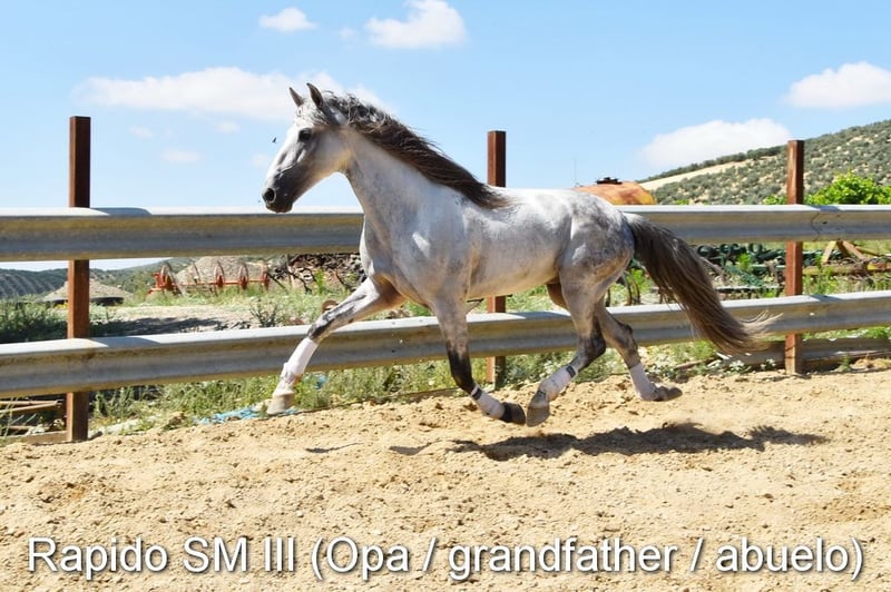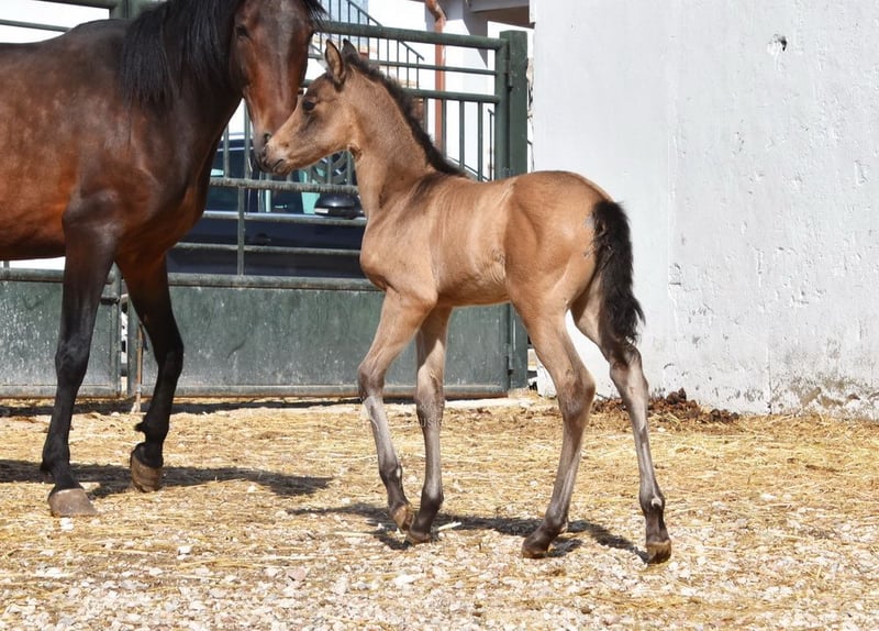 Dear character, curious and lively, currently outside with her mother, other mares, and foals. Good movement, unique color—a buckskin with PRE papers. Pedigree: Antonio Guiral Guarga, Castillo Villafranca, Paco Marti, Pedro Carmona Aguilar. www.elegante-andalusier.com