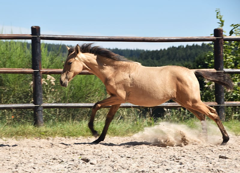 Luminosa ist eine Buckskin PRE-Stute, geboren am 4. April 2025, aus Herrerilla Cen und von Mar Wonderful. Ihre Mutter wurde von der bekannten Yeguada Centurión gezüchtet, Tochter des berühmten Delegado Mac, mit überwiegend Cárdenas-Blutlinien. Ihr Vater, unser perlino Hengst Mar Wonderful, hat sich bereits als erfolgreicher Züchter bewährt und uns mutige Fohlen mit schöner Bewegung geschenkt. Luminosa liebt den Kontakt zu Menschen und lässt sich nicht leicht beeindrucken. Sie hat all die Qualitäten, um das perfekte Familienpferd zu werden, sei es für Dressur, Freizeitreiten oder einfach als wunderbare Begleiterin. Sie wird mit vollständiger ANCCE-Dokumentation geliefert. Wir können auch TRACES-Dokumente arrangieren und den Transport organisieren, falls erforderlich. Luminosa ist in einer Herde auf der Weide aufgewachsen, wurde regelmäßig entwurmt und hat hochwertiges Futter erhalten.