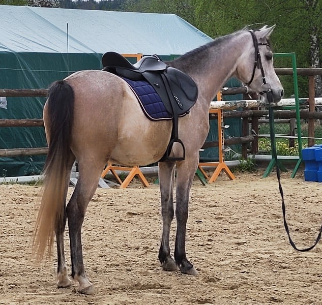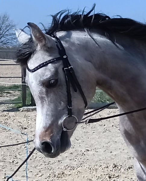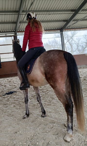 Nassim is a very affectionate, beautiful, and gentle gelding. I have owned him since he was 3 months old. He was raised in a good environment, socialized with peers and adult horses. Nassim is a lower-ranking horse and prefers to avoid conflicts. We started his training at four years old (spring 2025). We proceeded gradually and carefully, with patience. Groundwork, lunging with double lines, initially led by a giant teddy as his first rider, then progressing to first steps under saddle... He has always enjoyed participating and has never bucked once. After a growth spurt, we gave him a break. Now we have resumed training, and he hasn’t forgotten anything. On the contrary, he now balances himself better. Previously, we took him on rides in the countryside, and he is a very calm and trusting Arabian. He is ridden in walk and trot and is very well-behaved in all situations. Nassim has been a relaxed and affectionate horse since foalhood! He forms a strong bond with his handler. Unfortunately, I have become too heavy for him after an illness, and I feel hesitant to ride him myself (you can see the trainer in the photos). It is with a heavy heart that I have decided to find him a new home. I hope to find a kind person who can handle his sensitive and good nature with care and respect. Last summer, Nassim had an encounter with a barbed wire fence. Fortunately, no tendons or bones were affected, and everything healed perfectly. He bears no residual damage, but I want to be transparent about the incident. If you are looking for a truly loving horse—one that enjoys participating, learning, and is always happy for cuddles—he is the perfect match. I can very well imagine him as a Western riding horse, for trail riding, or simply as a wonderful leisure horse. Oh, I almost forgot—he also has excellent papers. His grandfather is the world champion Versage, and much more—but what matters most is that he is a truly fantastic companion.
