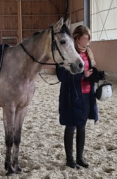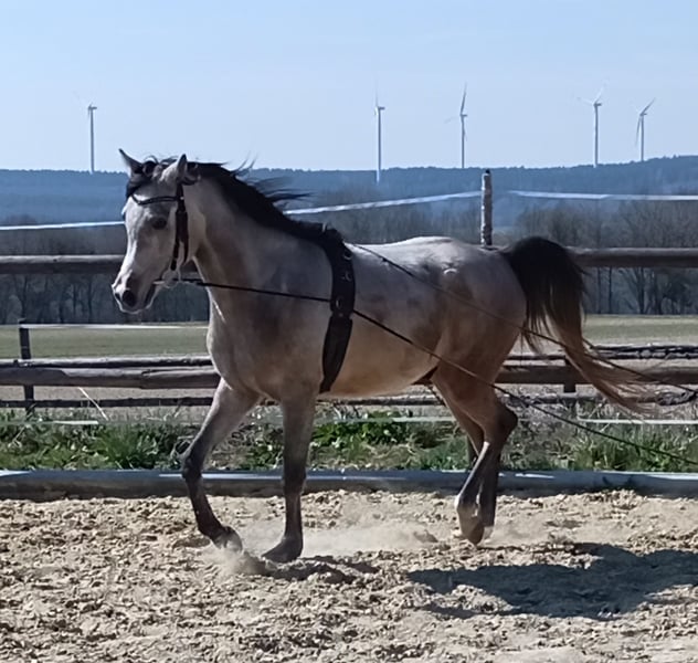 Nassim ist ein sehr menschenbezogener, wunderschöner und lieber Wallach. Ich habe ihn seit er 3 Monate alt ist. Er ist in einer guten Aufzucht groß geworden, mit Gleichaltrigen und erwachsenen Pferde. Nasim ist rangniedrig und geht Ärger lieber aus dem Weg. Wir haben 4 jährig (Frühling 2025) mit der Ausbildung begonnen. Kleinschrittig und achtsam ihm gegenüber. Bodenarbeit, Doppellonge, Riesenteddy als erster Reiter, dann erste Schritte unter dem Reiter... Er hat immer gerne mitgemacht und nicht ein einziges Mal gebuckelt. Danach hatte er einen Wachstumsschub und wir haben ihm eine Auszeit gegönnt. Jetzt haben wir wieder angefangen und er hat nichts vergessen. Im Gegenteil, er kann sich jetzt besser ausbalancieren. Zuvor sind wir mit ihm im Gelände spazieren gegangen und er ist ein sehr ruhiger und vertrauensvoller Araber. Er ist angeritten im Schritt und Trab und bei allem sehr brav. Nassim war von Fohlen an ein cooles Pferd und sehr verschmust!! Er bindet sich sehr an seinen Menschen. Leider bin ich für ihn zu schwer (nach Krankheit) geworden und ich habe Skrupel ihn zu reiten (auf den Bildern sieht man die Bereiterin). Deshalb habe ich mich schweren Herzens entschlossen, ihn doch abzugeben. Ich hoffe einen lieben Menschen zu finden, der mit seinen feinen und guten Charakterzügen fein und gut umgehen kann. Nassim hatte letzten Sommer "Bekanntschaft" mit einem Stacheldrahtzaun gemacht. Zum Glück waren keine Sehnen oder Knochen betroffen und es ist alles wunderbar verheilt. Er hat keine Schäden zurückbehalten, dennoch sage ich es dazu. Wer ein durch und durch liebes Pferd haben möchte, eines das gerne mitmacht, gerne lernt und für jede Kuscheleinheit froh ist, ist bei ihm goldrichtig. Ich könnte ihn mir sehr gut als Westernpferd vorstellen - oder zum Wanderreiten, oder einfach als tolles Freizeitpferd. Ach ja, fast vergessen. Er hat auch super Papiere, sein Opa ist der Weltchampion Versage, und und und - aber viel wichtiger ist doch, dass er ein wirklich toller Gefährte ist..