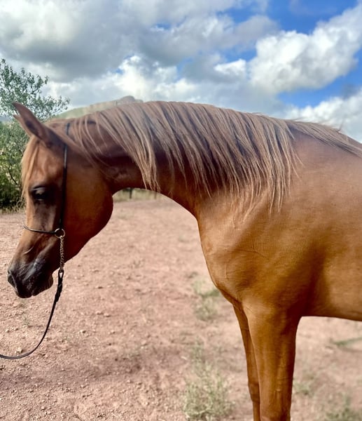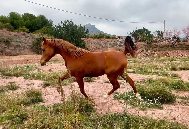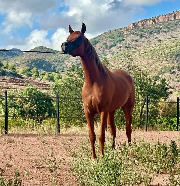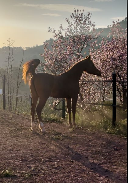 Elegant Arabian Mare – Born 2023 Discover the beauty and grace of this stunning Arabian mare, born in 2023. With her striking chestnut-red coat and refined features, she embodies the modern Arabian horse elegance. Standing at 155 cm, she boasts a balanced and athletic build. Her excellent breeding background ensures a promising future, whether for show, breeding, or riding. She has been carefully raised with attention to her development and socialization. Don't miss the opportunity to own this exceptional young mare with a bright future ahead. For more details and to arrange a viewing, please contact us.