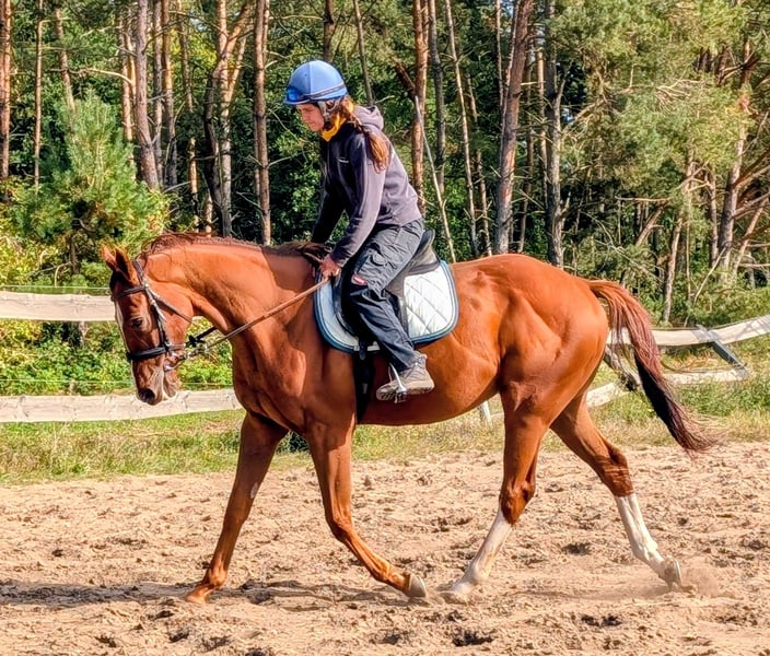 Pauli, 4-letni, grzeczny wszechstronny wałach. Pauli to przyjazny, otwarty i bardzo chętny do nauki wałach w kolorze kasztanowym. Jest spokojny w terenie, zarówno na lonży, jak i podczas pracy w ujeżdżeniu. Młody wałach, przed którym stoją jeszcze wszystkie drogi otworem. Pauli przebywa w dużej, mieszanej stadzie i dogaduje się z wałachami oraz klaczami, jest kowalsko i transportowo spokojny, zaszczepiony, zaczipowany i odrobaczony. W celu uzyskania dalszych informacji lub umówienia się na wizytę proszę o kontakt przez WhatsApp lub telefon! 01633276779 www.pferdestaerke-aktiv.de