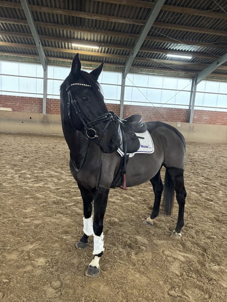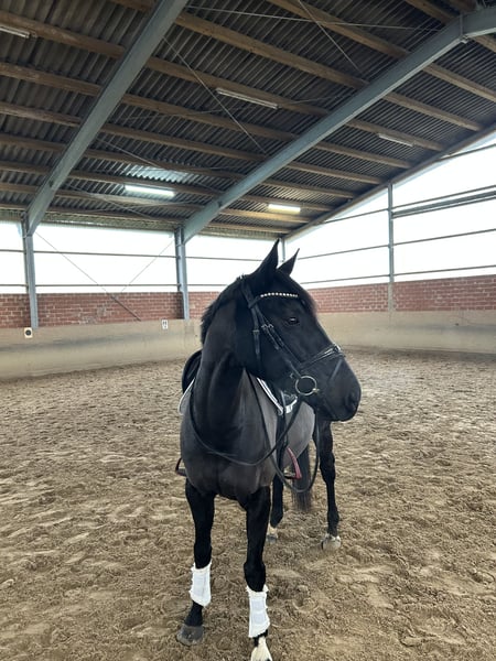 Miro is a 7-year-old Thoroughbred gelding with a height of 1.58 meters. Despite his size, he also comfortably carries taller riders (the rider in the video is 1.77 m). He was directly purchased from the breeder at the age of three and has never raced. I have mainly trained him in dressage. He is used to riding in groups in all three gaits, and we have also been on rides in the Emsland region. Miro is a truly sweet horse and a real character, but due to his age and Thoroughbred nature, he needs a confident handler. When given security and clear boundaries, he is willing to learn and does everything asked of him. Miro is not a horse that runs on autopilot; he prefers to be ridden correctly at the bit and on the leg, and he is very sensitive to aids. I would not describe him as suitable for beginners, mainly due to his age and training level. He has not been trained in jumping, as I never had an interest in that, but I can imagine he would enjoy it and could also be a good all-rounder. Due to my lack of time, he has been on a break for a longer period, but he is currently being retrained. The lack of time is also the reason for his sale. He is used to being kept with mares or geldings and has never caused any issues in that regard. Currently, he is stabled in a paddock box. The video was taken last week and shows his current training progress.