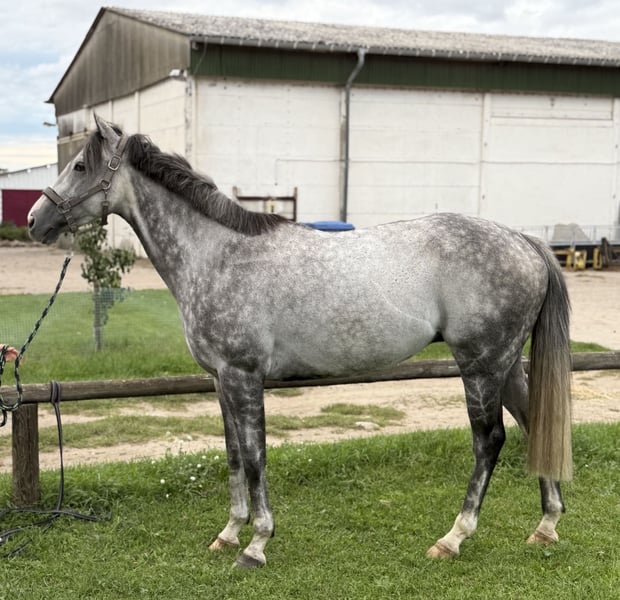 Thoroughbred gelding, 7 years old, height 159 cm "Skipjack" ran his last race in August 2025 and leaves the racing world injury-free and motivated for a second career. He is sensitive and intelligent, and he shows great potential in the first sessions in the riding arena. He impresses with very good basic gaits and body awareness but needs an experienced and empathetic rider. Both jumping and dressage are possible. Please note: "Skippi" is and will remain a Thoroughbred, and his current training level is more akin to that of a remount. Racehorses need to learn the aids for riding horses! Only to a sensitive rider with experience in young horse training and/or with ex-racehorses who is interested in a project with potential.