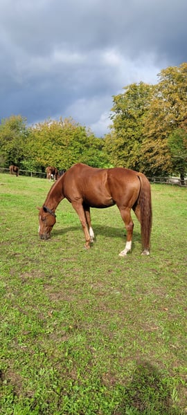 Suche für meinen lieben gesunden lustigen Wallach den allerbesten Möhrchenspender Tomy ist 7 Jahre alt, 163m groß. Nach 5 Rennen ist er aus dem Rennsport ausgeschieden: "Er war stets bemüht". Er ist super herdenverträglich und steht aktuell in einer Gemischten Herde mit gut 20 Pferden. Ich würde ihn als Allrounder im Freizeitbereich bezeichnen. Er ist unerschrocken, liebt Ausritte (lässt sich im Galopp am langen Zügel reiten), Trails und ist auch hoch konzentriert bei gymnastischen Tätigkeiten in der Halle oder auf dem Platz. Mittlerweile kann er sehr auf dem Zirkel galoppieren und wir arbeiten an Seitengängen usw. Er steigt und beißt nicht. Im Übermut kann durchaus bei knackigem Wetter ein Buckler kommen, die kann ich an einer Hand in den letzten 3 Jahren abzählen. Ich schreibe das extra dazu, weil viele Suchende ein super verlässliches Pferd für Anfänger/ Wiedereinsteiger suchen. Für mich ist er ein verlässliches cooles Pferd, jedoch ist er kein Anfängerpferd. Aufgrund seines Alters braucht er einen Menschen, der keine Angst vor dem Reiten hat und Sicherheit ausstrahlt. Er orientiert sich sehr an seine Bezugsperson und ist sehr menschenbezogen. Er kennt Traktoren, Hunde, Hühner und anderes Getierchen. Aktuell läuft er barhuf, benötigt jedoch Hufschuhe bei steinigen Böden. Ich gebe ihn nur ab, wenn es wirklich 100%ig passt. Es eilt nicht und für kleines Geld geht er nicht weg, dazu habe ich schon viel in seine Ausbildung investiert. Der Grund weshalb ich eine neue Bleibe suche ist rein finanziell und es wird mir auch das Herz brechen. Da ich noch einen Oldie habe, fällt natürlich die Wahl, den Oldie zu behalten. Was ich mir für ihn wünsche: Haltung im Offenstall mit Weide, tagsüber viel Auslauf, dann ginge auch Nachts eine Box, er kennt Aktivstall und kommt super zurecht. Bitte keine Anfragen von Händler oder Reitschulbetriebe, 24-Std-Boxenhaltung.