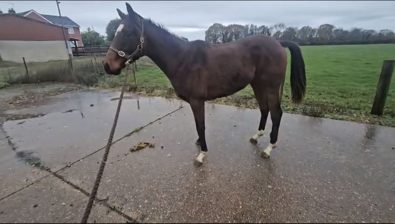 Beautiful dark race horse in early flat racing training will make a champion looking for a great new home
