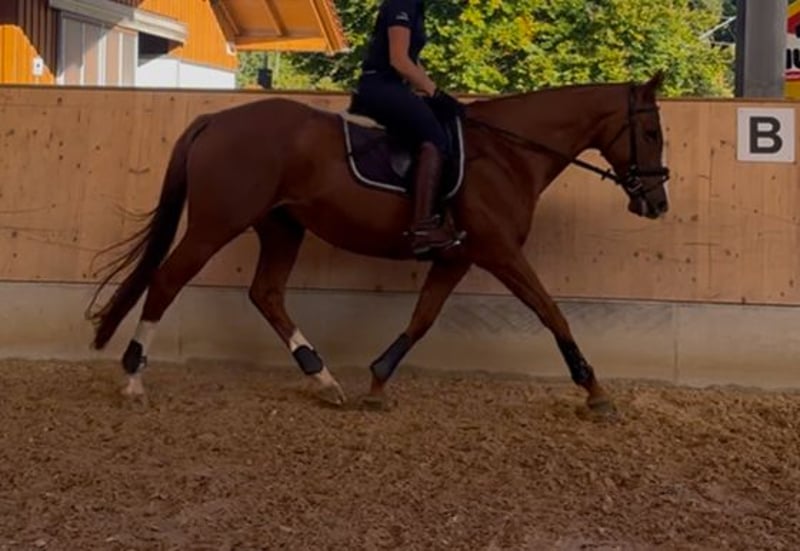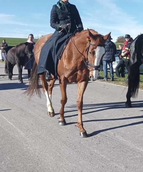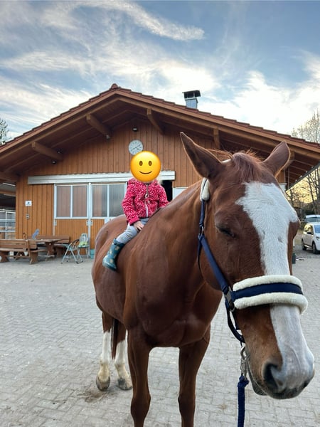 We are seeking a permanent home for our very sensitive 10-year-old mare Betty! She reliably participates in our riding school lessons for beginners, advanced riders, and riding badge courses. She is very ambitious in dressage and jumping and loves trail rides. She has also taken part in Leonhard parades several times. Since she responds very delicately to aids, finding a dedicated rider for her would be ideal to support her further training. She is kept in a mixed herd, with options for box, open stall, or pasture turnout. She has also foaled a beautiful foal by the dressage stallion Rivero. The mare is healthy, regularly checked by the veterinarian, dentist, saddle fitter, and farrier. She is also shoe- and loading-safe. Suitable tack can be purchased together with her. We would be happy to offer an informal riding lesson on Betty to see if she’s the right match.