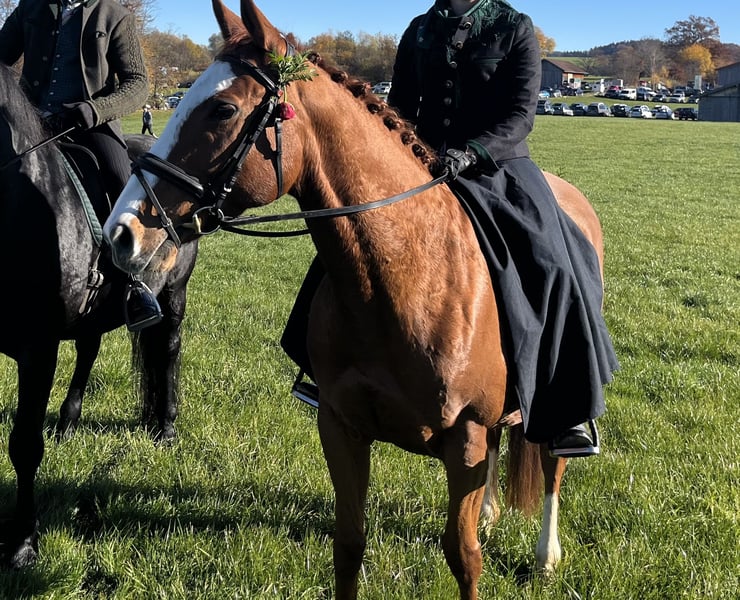 Wir suchen für unsere sehr fein zu reitende erst 10 jährige Betty ein festes Zuhause! Die Stute läuft sehr zuverlässig in unsere Reitschule in Anfänger- Fortgeschrittenen-, Reitabzeichenkurse mit! Sie ist sehr ehrgeizig in Dressur- und Springen und liebt Ausritte. Auch war sie schon des Öfteren bei Leonhardiumzüge dabei. Da sie sehr fein auf Hilfen reagiert, wäre es für ihre weitere Ausbildung toll, einen festen Reiter für sie zu finden. Sie steht in einer gemischten Herde sowohl Box, als auch Offenstall und Koppel. Auch ein tolles Fohlen vom Dressurhengst Rivero hat sie schon zur Welt gebracht. Die Stute ist gesund, wird regelmäßig beim Zahnarzt, Sattler und Hufschmied vorgestellt Auch ist sie schmiede- und verladefromm. Passendes Zubehör kann gerne miterworben werden. Gerne können wir ganz unverbindlich eine Reitstunde auf Betty vereinbaren.
