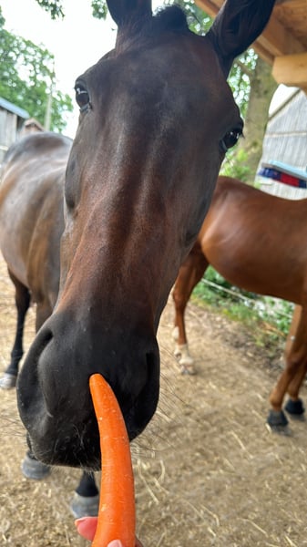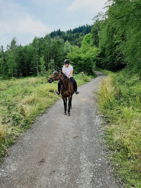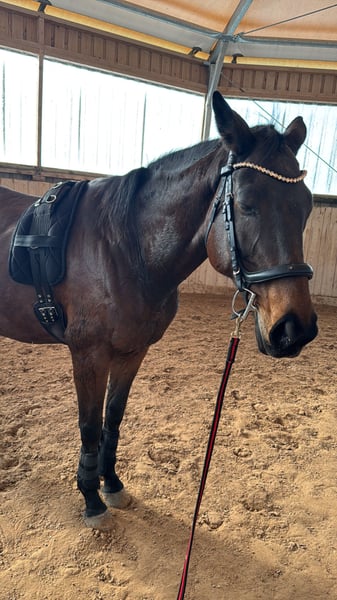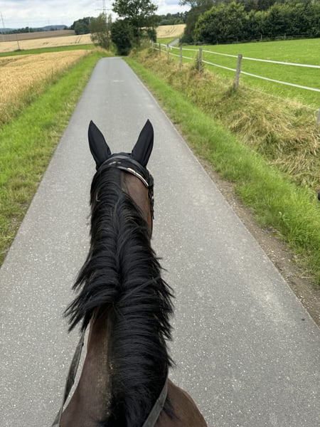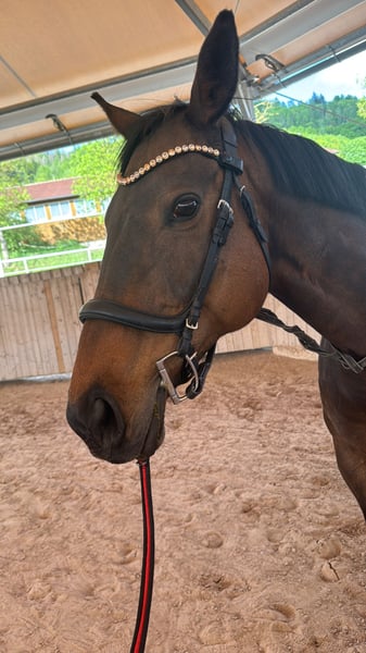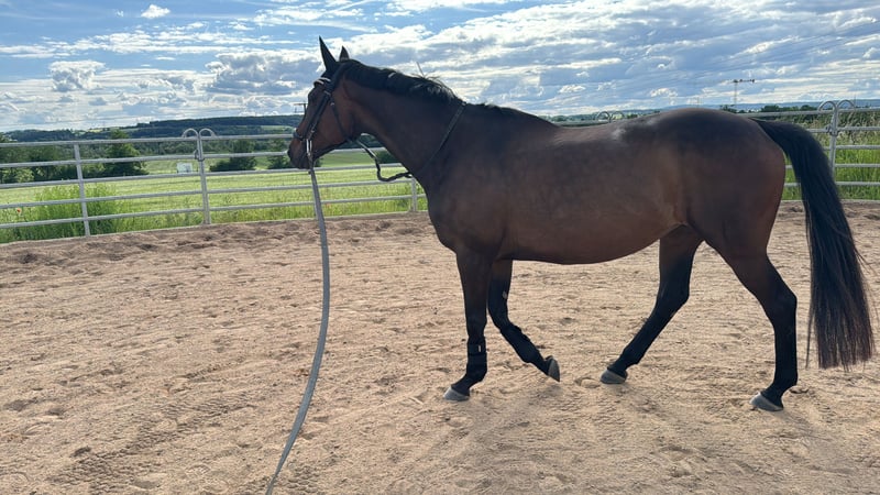 With a heavy heart, I am seeking a new home for my 14-year-old, approximately 16.1 hh Thoroughbred mare, "You'll Never Run Alone" (called Quenny). Due to personal circumstances (starting a family) and the resulting lack of time, I can no longer give her the attention she deserves. Quenny is experienced both under saddle and on the ground. In daily handling, she is well-behaved and confident. She handles desensitization exercises calmly and unphased. She is very human-oriented, though she prefers a small number of stable, trusted handlers. Frequent change of riders can unsettle her, so she may test her boundaries initially. Therefore, I am looking for a person who is empathetic, experienced, and calm to provide her with the security she needs. Quenny is not suitable for beginners or insecure riders. Due to time constraints, Quenny is currently mostly worked from the ground. Therefore, her training should initially focus on a healthy, varied fitness program to facilitate her reintegration into full work. With thoughtful promotion, her riding potential can certainly be further developed. She is generally accustomed to hacking out in open terrain. She is curious and interested in her surroundings and always manageable on the lead. However, due to my limited time, she currently lacks some routine during rides. With a confident rider and more experience, she will become a lovely leisure partner. The mare is shoe- and loading-safe and currently barefoot. For very rocky paths, she wears front hoof boots. She has been regularly vaccinated and dewormed. Dental checks are performed annually as standard. In interactions with other horses, she is consistently open and socially compatible. She currently lives peacefully in a mixed herd with a gelding and four other mares. At night, she is housed in her own box; during the day, she enjoys paddock or pasture turnout. For the future, I wish for her to have a home where she can continue to enjoy plenty of turnout and social contact throughout the year. If Quenny has piqued your interest, I look forward to hearing from you. We can happily arrange a date for a personal meeting!