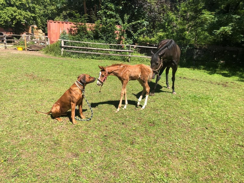 IKONE Ihr Name ist Programm. Eine feine sensible und mitdenkende Vollblutstute, die immer alles richtig machen möchte. Auf dem einen Foto als Fohlen. Kerngesund. Hart auf den Beinen. Keine Allergien. Eine wunderhübsche Stute für ein hübsches Mädchen? Sehr menschenbezogen. Ein Pferd, das mit einmal gefasstem Vertrauen nicht nur alles mitmacht sondern als Partner durch dick und dünn geht. IKONE ist auch eine Besonderheit vom Pedigree her. Ihr Vater ist der australische Deckhengst COUNTERATTACK ( führender Deckhengst in Europa ), noch außergewöhnlicher: ihre Mutter ist Vollschwester zu dem Gr I Sieger und Deckhengst INTENDANT, der aufgrund seiner Rittigkeit auch erfolgreich in der Warmblutzucht deckt.