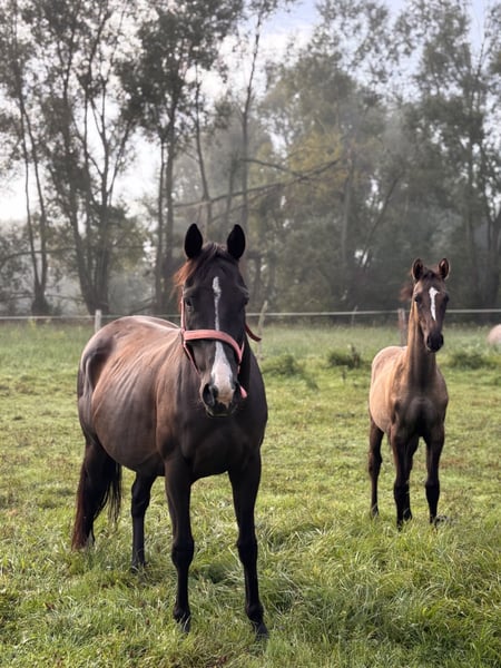 Unridden mare. She is used to leg aids, has been tied up, and walks on a halter. She has not been driven in a trailer. Gaba is a calm and well-balanced horse, raised on pasture within a large herd. She is easy to handle and gets along well with other horses. Good mother. She was measured at 148.5 cm. Possible sale with her foal born in 2025. Foal born in April 2025. A large pony, with a target height of approximately 146/8 cm. Her dam is a full-blooded English Thoroughbred, daughter of the stallion Nowogródek, from a Jape mare. Her sire is Crème Couleur — a descendant of a European Championship medalist. The foal was raised on free-range pasture. Correctly built and well-moving.