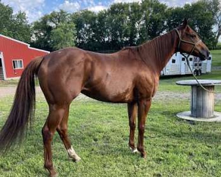 Meravigliosa mare OTTB di 7 anni. È tranquilla, equilibrata e una velocissima apprendista. Fa praticamente tutto ciò che le si chiede. Ha corso su pista e ha vinto un LTE di 40.000. È aggiornata con le vaccinazioni e il test Coggins. Purtroppo non ho abbastanza tempo per dedicarle e farla lavorare come si deve, per completarla e renderla competitiva. Facile da ferrare e da mettere in tiro, adora il bagno ed è facile da gestire.