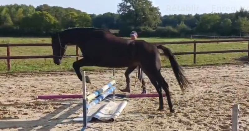 Jolie jument noire 8 ans, avec de belles allures. Douée sur les obstacles à pied. Très énergique, il lui faut EXCLUSIVEMENT un cavalier confirmé. Vidéo disponible