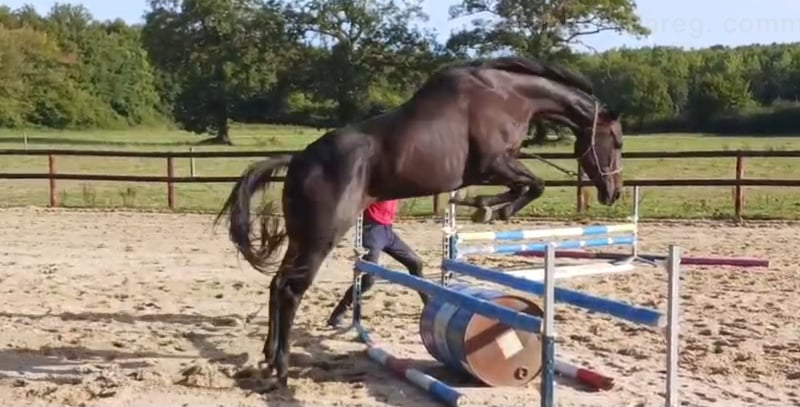 Jolie jument noire 8 ans, avec de belles allures. Douée sur les obstacles à pied. Très énergique, il lui faut EXCLUSIVEMENT un cavalier confirmé. Vidéo disponible