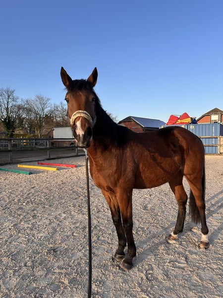 For sale is the 8-year-old Thoroughbred mare Giodonna (known as Donna), with a height of approximately 16.1 hands. Donna retired from racing in 2021 due to her tendency to become stressed under high pressure. She is a sweet, sensitive, and very attentive mare who enjoys working and aims to please. As is typical for a Thoroughbred, she possesses temperament and expressiveness but requires clear, calm guidance, making her unsuitable for beginners. Currently, she is being ridden recreationally in a Western style and is accustomed to working with a bosal. Her behavior during groundwork, lunging, and horsemanship exercises is particularly commendable—she is well-behaved, motivated, and highly cooperative. Donna is currently living in an open stable in a mixed herd and is well integrated. We are seeking an experienced horse person, ideally with Thoroughbred experience, who can provide her with time, understanding, and confidence. Price is negotiable. Further information gladly available upon request.
