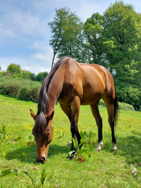 Royal est un cheval pur-sang ayant couru pendant 3 ans en courses de haies. Sociable et agréable lors des soins, il est actuellement au pré et pieds nus. Il nécessitera une remise au travail progressive. Ce cheval n’est pas destiné aux débutants. Idéal pour l’extérieur ou le travail à pied, il n’est pas recommandé pour le travail en carrière ni pour un club.