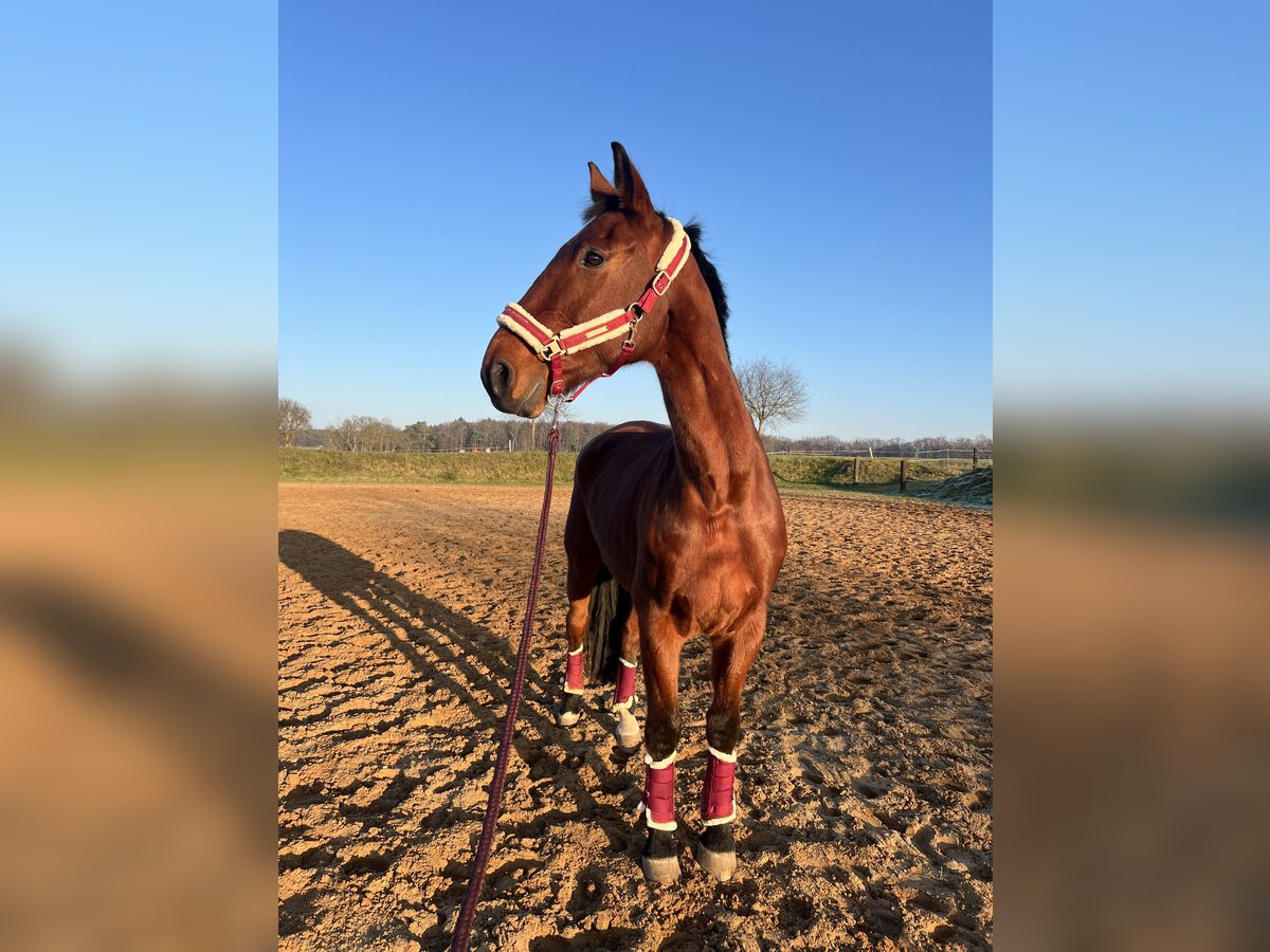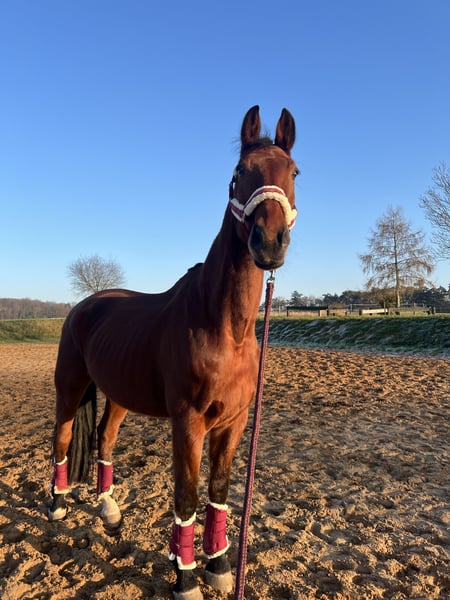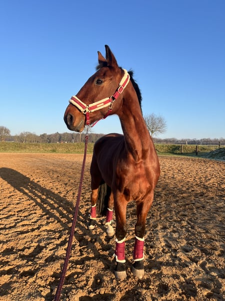 For sale is a 13-year-old Rhinelander gelding with a height of approximately 183 cm (around 16.1 hh). He is a sensitive, finely ridden horse suitable for experienced riders, responding very well to subtle aids. In the terrain, he is reliable and calm under saddle, even when ridden alone. He is shod barefoot and behaves well in daily handling. He is suitable as a dressage and leisure horse, but not as a jumping horse. A mild seasonal pollen allergy is present, which is well-managed with medication and currently does not affect him.