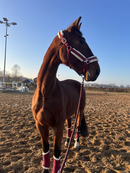 Zum Verkauf steht ein 13-jähriger Rheinländer Wallach mit einem Stockmaß von ca. 183 cm. Er ist ein sensibles, fein gerittenes Pferd für erfahrene Reiter, das sehr gut auf feine Hilfen reagiert. Im Gelände ist er zuverlässig und nervenstark, auch allein. Er wird barhuf geritten und ist im täglichen Umgang brav. Er eignet sich als Dressur- und Freizeitpferd, kein Springpferd. Eine leichte saisonale Pollenallergie ist vorhanden, diese ist gut medikamentös eingestellt und schränkt ihn aktuell nicht ein.